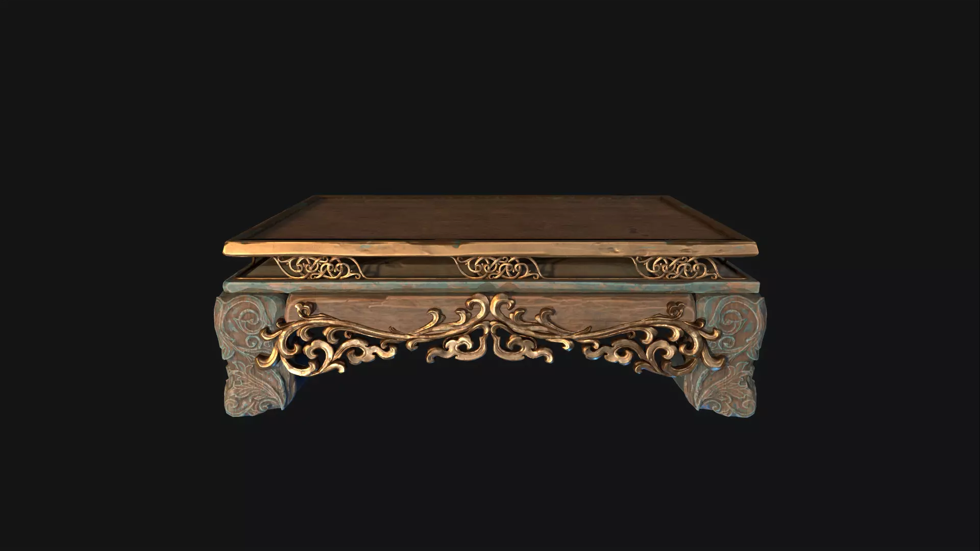 A detailed wooden table featuring intricate metal ornamental elements, perfect for cultural interiors, temples, tea rooms, palaces, or historical environments. The combination of carved wood and refined metalwork gives this asset a premium handcrafted look suitable for both real-time and cinematic scenes.Designed as an elegant focal furniture piece that adds authenticity and visual richness to your environment. FeaturesHigh-quality wooden body with metal ornament detailsGame-ready PBR texture workflowFully unwrapped UVsClean and efficient topologyGreat for close-up rendering or set dressing Technical SpecificationsVertices: 36656Polygons (Faces): 50218UV Layout: Non-overlappingTextures: 4K PBR texture maps: Base Color Roughness Metallic Normal AO ORM .PNG .JPGFile Formats: FBX / OBJ
