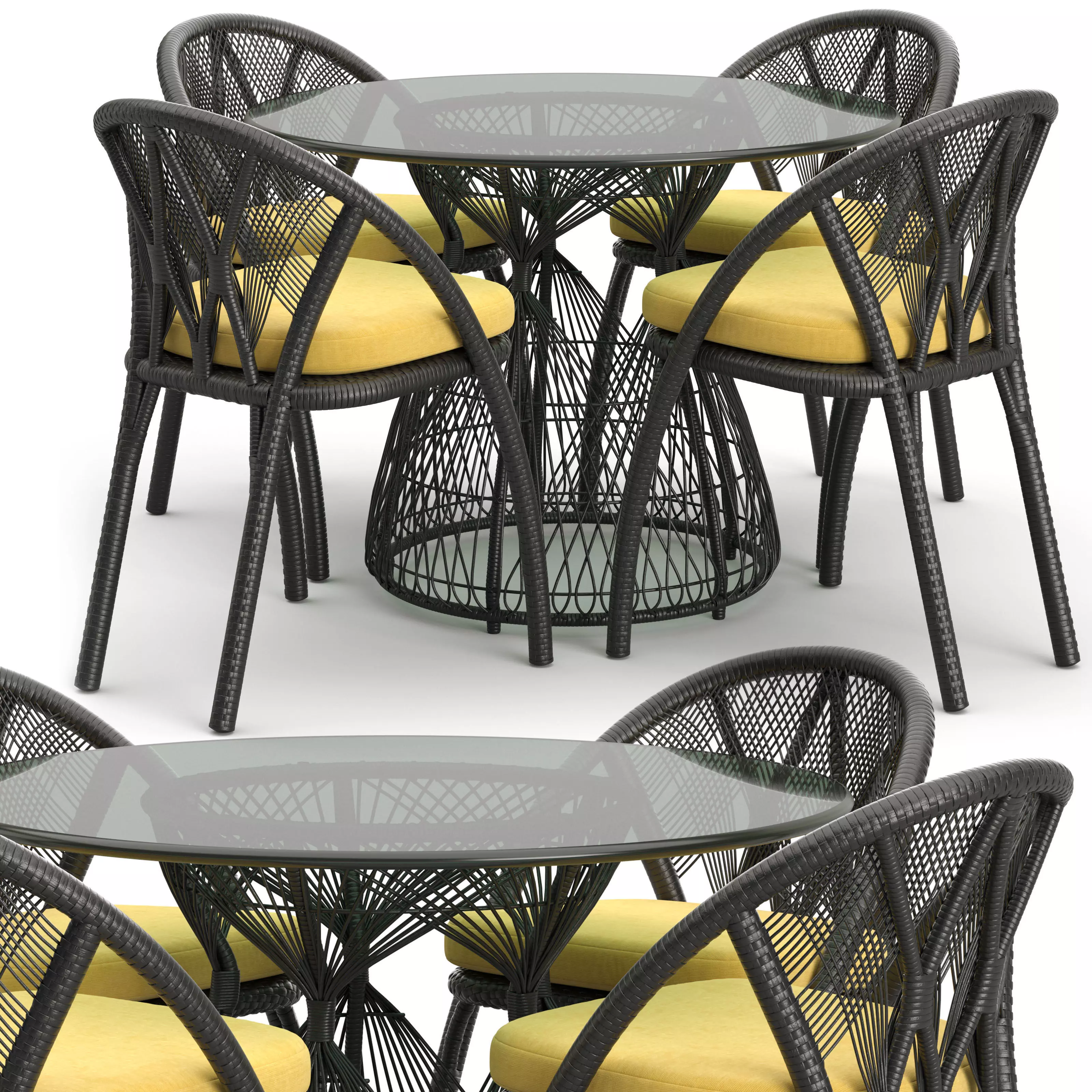 HAGIA dining set 3D model, modern dining table and chairs 3Ds Max, outdoor furniture 3D, V-Ray glass table 3D, woven chair set OBJ.