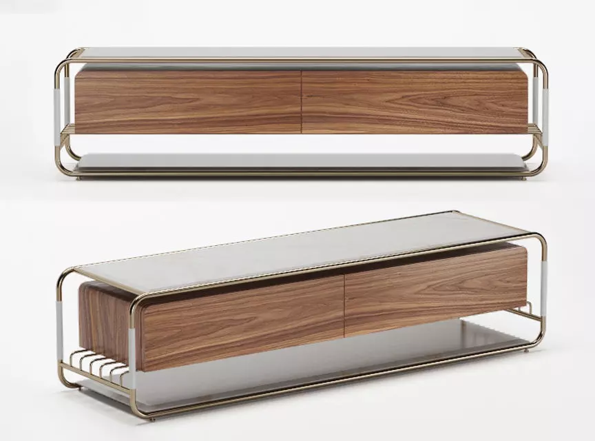 Lautner is a television table that uses a tubular structure made of polished brass as a support. It combines clean lines with the most noble materials of mid-century design, using marble on the countertop and lacquered walnut wood on two long drawers. There is a shelf at the base for additional storage.