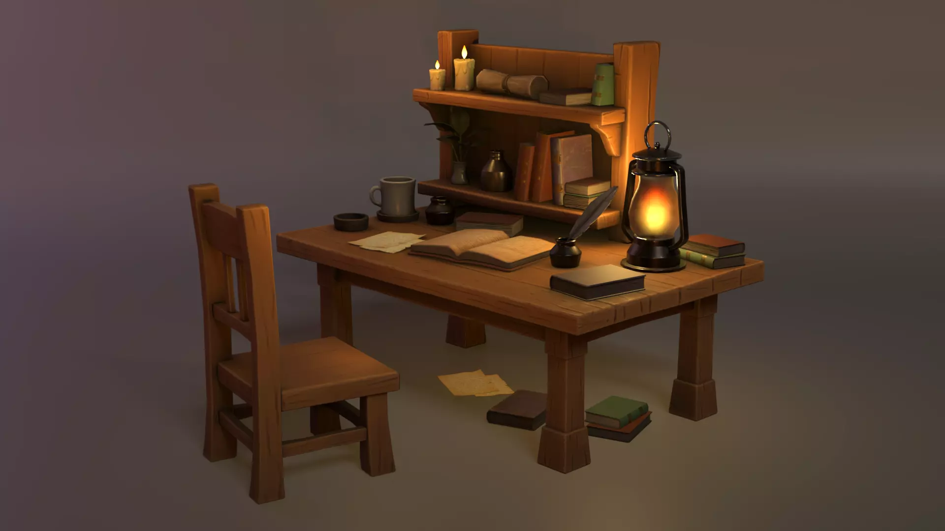 A highly detailed stylized fantasy study desk set, perfect for games, animations, or environment scenes. The set includes a wooden desk, chair, bookshelf, and various props such as an oil lantern, candles, books, ink bottles, a quill, coffee mug, and scattered papers. Designed in a charming low-poly style with PBR materials and 4K textures, this model is optimized for both close-ups and real-time engines.
