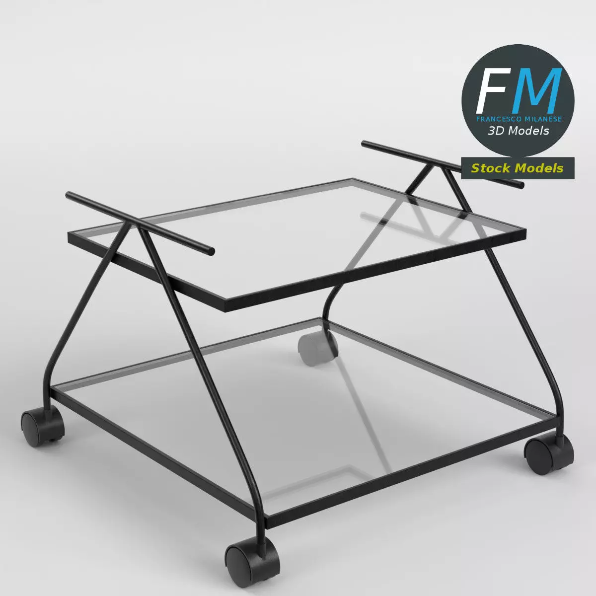 A sleek modern bar cart with a black metal frame, dual glass shelves, and caster wheels 3D Model. 7 objects (4 wheels, 1 frame, 2 glass panels), sharing 2 non overlapping UV Layout maps, Materials (frame and wheels; glass), and PBR Textures sets. Production-ready 3D Model with non overlapping UV Layout map provided in the package. PBR Materials and Textures (Metallic Workflow: Base Color, Metallic, Roughness, Normal) embedded in the Blend, FBX, and GLB files.Easily customizable: UV unwrapped geometries; UV Layout maps provided in the package as png with alpha images.Quads-only geometry.Made with Blender 4.5 LTS with Cycles Principled BSDF (PBR, Metallic Workflow) Material, then exported to other formats (OBJ, FBX, GLB; FBX and GLB have embedded textures).Promo images: some renderings made with Cycles for Blender, plus Wireframes and Blender screenshots (Object Mode, Edit Mode with UVs).Formats included: FBX with embedded PBR Textures (Metallic Workflow: Base Color, Metallic, Roughness, Normal), GLB with embedded PBR Textures (Metallic Workflow: Base Color, Metallic, Roughness, Normal), OBJ; scenes: BLEND (with Cycles Principled (PBR) Materials); other: 16-bit PNGs with Alpha.7 Objects (meshes), 2 PBR Materials, UV unwrapped (non overlapping UV Layout map provided in the package).UV Layout maps and Image Textures resolutions: 2048x2048.Polygonal, QUADS-ONLY, 10060 vertices, 10036 quad faces (20072 tris).Real world dimensions; scene scale units: METERS in Blender 4.5 LTS (that is: Metric with 1.00 scale).Uniform scale object (scale applied in Blender 4.5 LTS).PBR Textues included: in a zipped folder, you'll find the PBR Textures set (as 16-bit PNGs with Alpha).IMPORTANT --- Main renderings made with Blender 4.5 LTS + Cycles using an HDR Environment Texture Image which is NOT provided in the package!