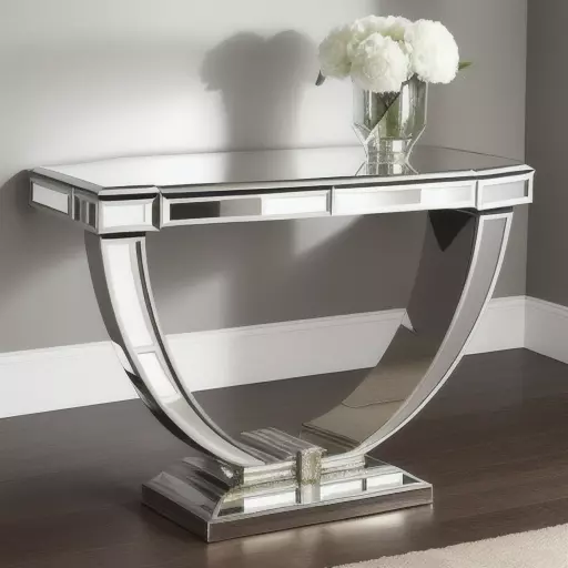 This art deco console table channels the glamour and elegance of the 1920s. It is constructed from mirrored glass with a geometric patterned frame in a shiny silver finish. The table has a half-moon shape and a curved pedestal base. Its opulent design and reflective surfaces make it a show-stopping addition to any luxurious interior.