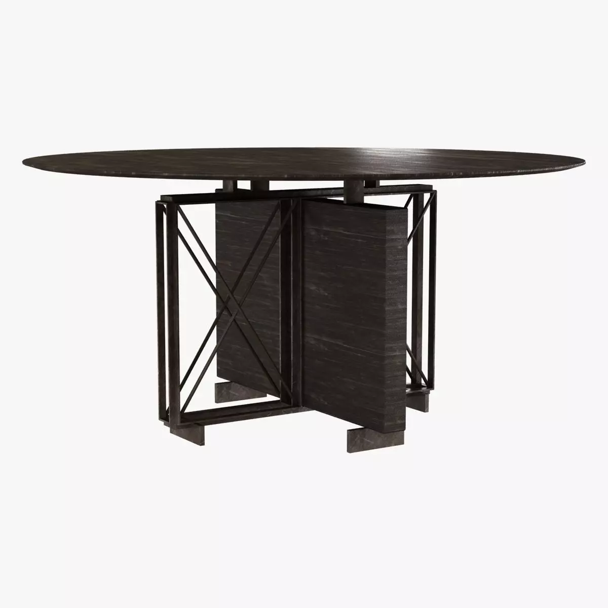 MON0-DTDesign Jean-Michel WilmotteA vision of architecture brought into your home, the Monaco Dining table is an explicit tribute to the elements of structure and construction. Crisscrossing metal creates a graphic pattern within the base, and activates the space with its clear-cut lines. The top is made from a solid piece of oak spun on a massive scale to yield the delicate beveled perch, a unique and impressive feat of engineering for such a large piece of wood.