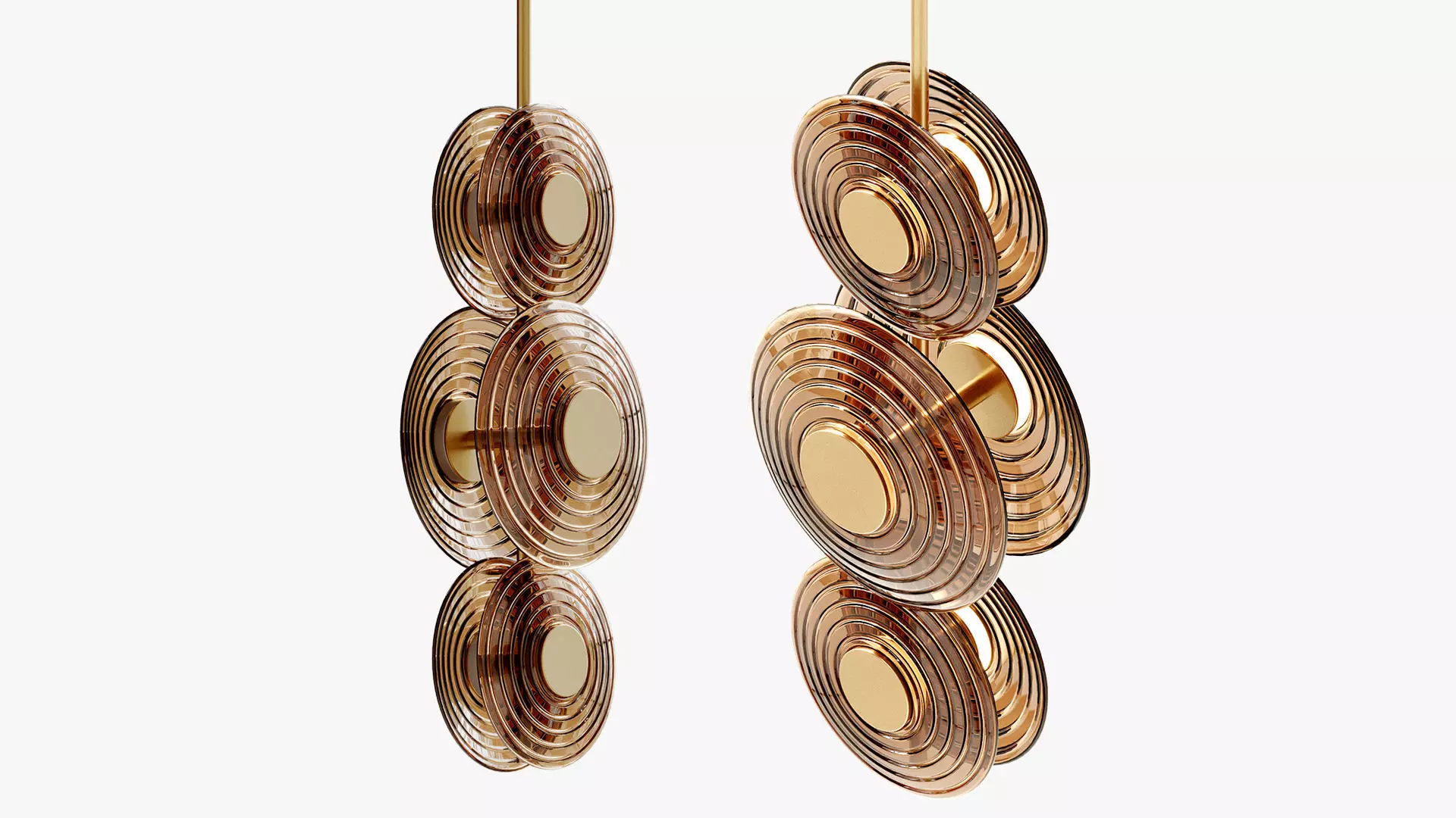 Discs of ribbed clear smoke glass capped in Aged Brass take cues from rippling waves to create the glamorous retro aesthetic of Griston