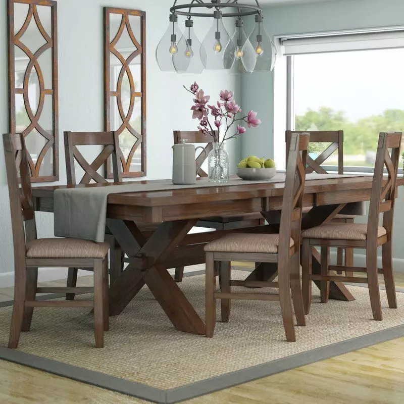 Gather friends and family for Sunday brunch or a celebratory meal around this solid wood dining table, featuring a beautiful dark hazelnut finish and trestle base. Delicate details can elevate an everyday tablescape to a refined display worthy of a dinner party. Dress it with a burlap runner and blooming hydrangeas for charming style, or let it be a rustic anchor for crisp plates and crystal serveware. Guests will always be up for a peek into your kitchen to see what scrumptious creation is waiting on this elegant dining table set. Whether it's a special occasion or an everyday brunch, this chic design elevates the appeal of any get-together. Want to lean into the modern farmhouse aesthetic? Place this set in your dining room, then top it with crisp white serveware, Mason jar glasses, light blue linen placemats, and a bouquet of wildflowers nestled in a large white pitcher vase.