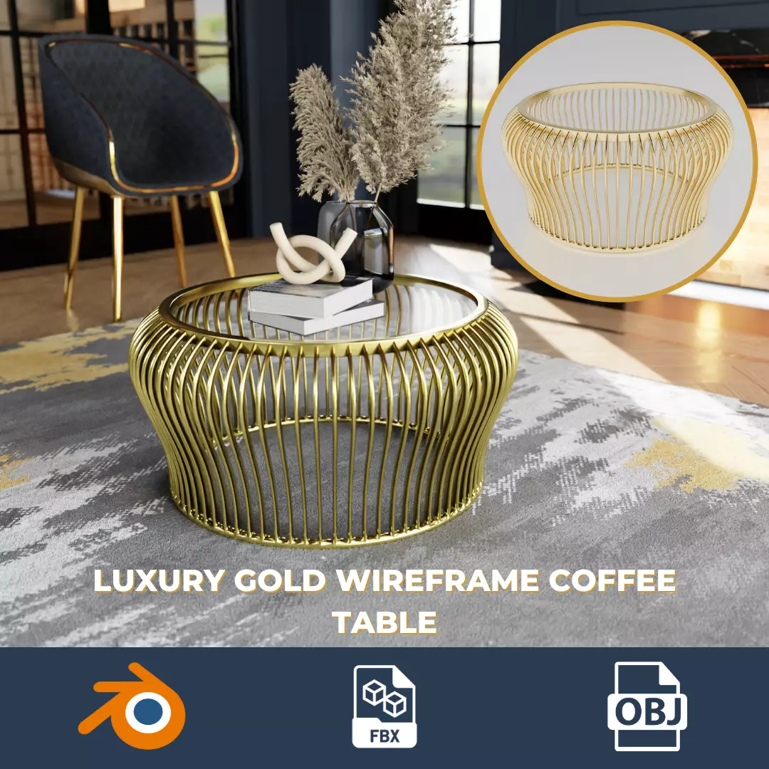 This luxury gold wireframe coffee table is a high-quality 3D model perfect for interior design projects, architectural visualization, and product rendering. Featuring a sleek, modern metal frame with a reflective glass top, this elegant table is an ideal addition to contemporary, minimalist, or high-end spaces.