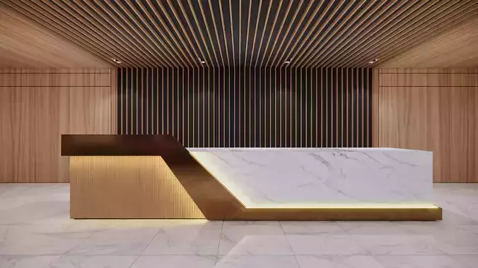 A high-quality modern luxury reception desk designed for upscale interior spaces such as hotels, offices, corporate lobbies, clinics, and residential foyers.The scene features a sleek marble reception counter with integrated warm LED lighting, paired with elegant wood paneling and vertical slat wall details for a contemporary architectural look.