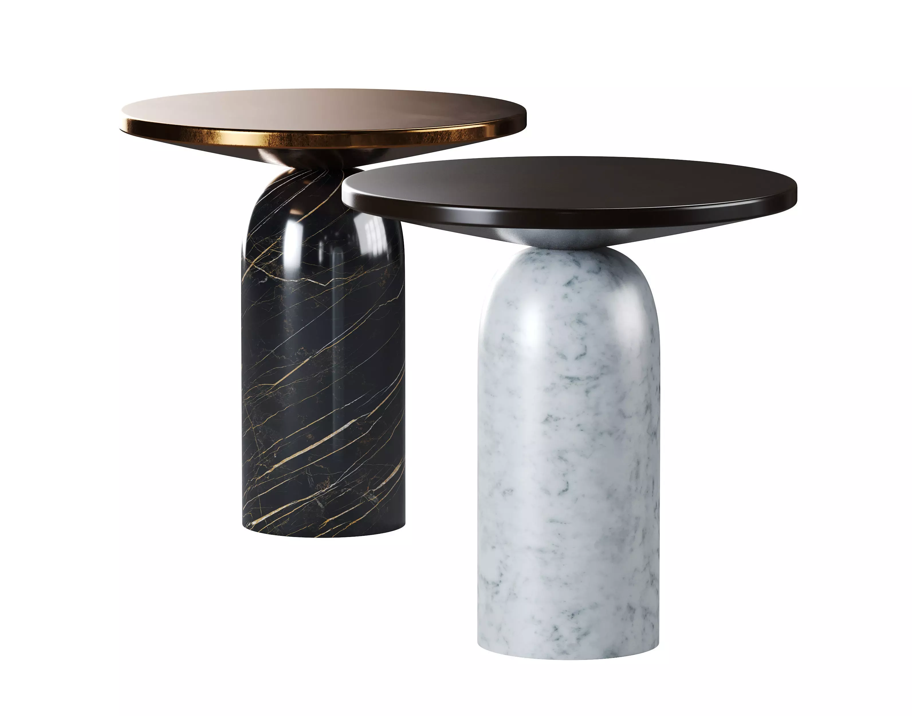 Realistic 3D model of the Martini side table by CB2 and designed by VUUE featuring a round gunmetal top on a domed white or black marble base.