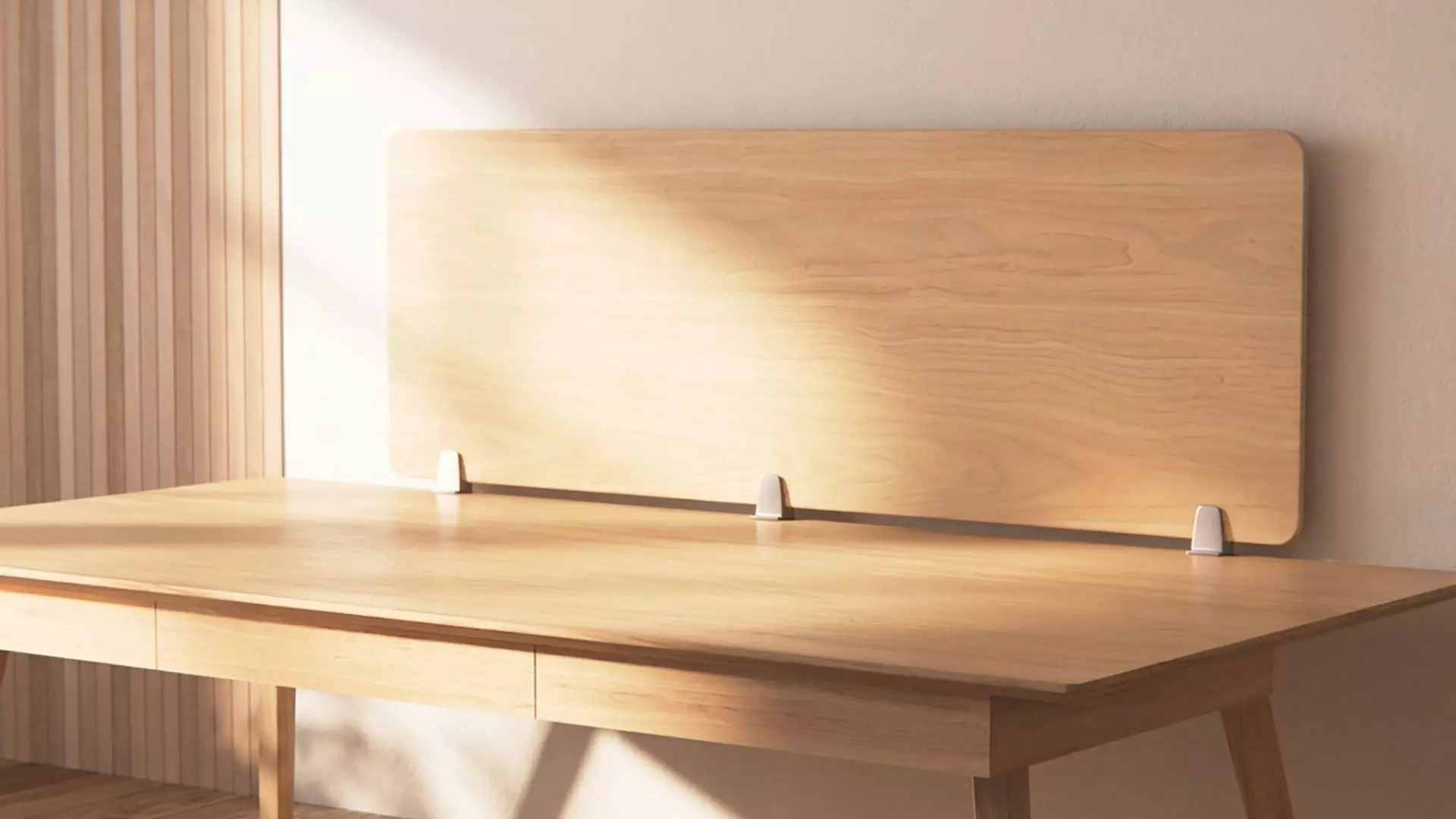 A minimalist desk divider / privacy screen in cohesive Japandi style — wood panel withclamp mounts, sized for standard desk depth. Clean, functional, render-ready.