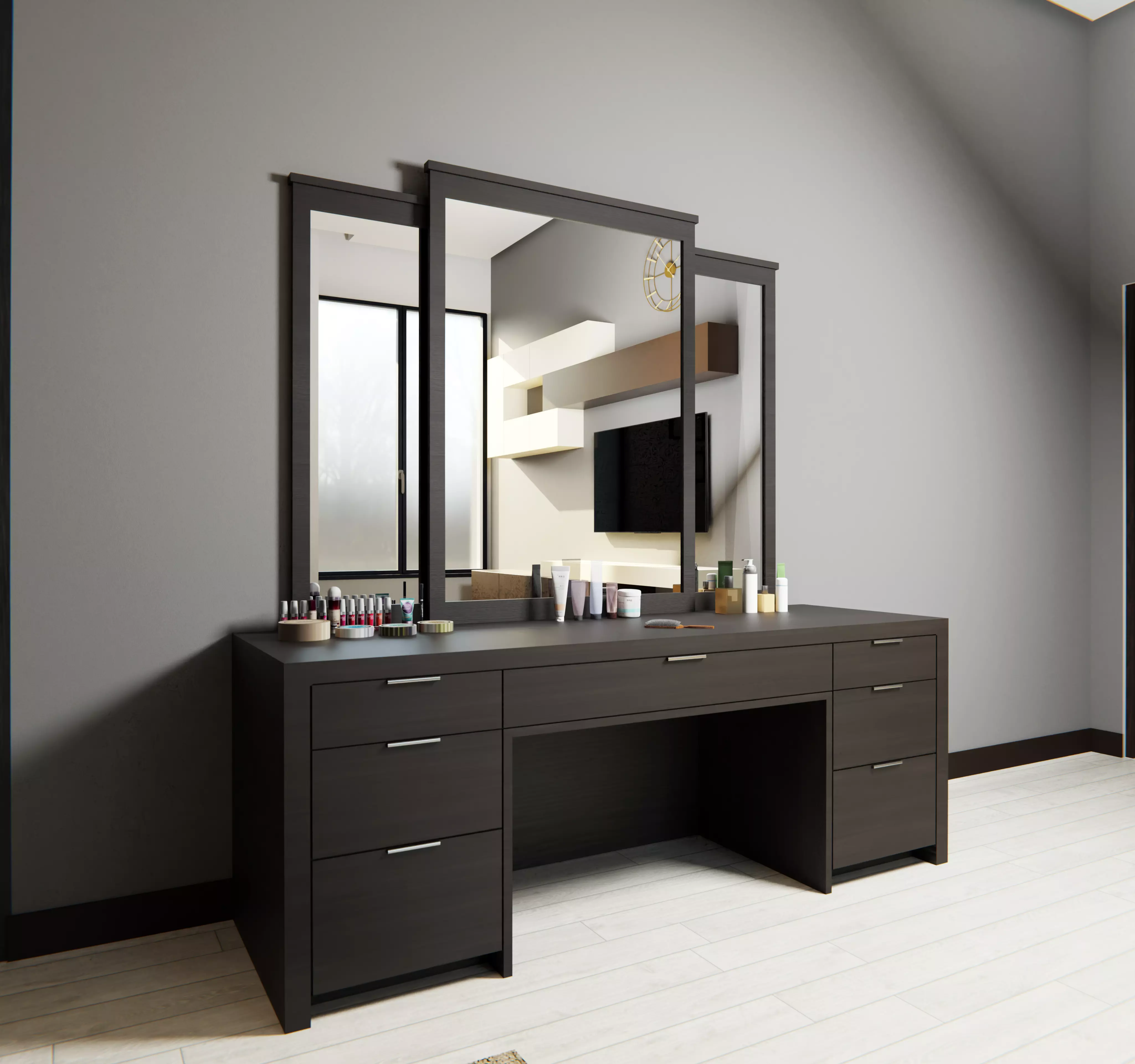 A modern and simplistic wooden dressing table made in Blender, low poly, UV textured and ready to use (Cosmetics not included).