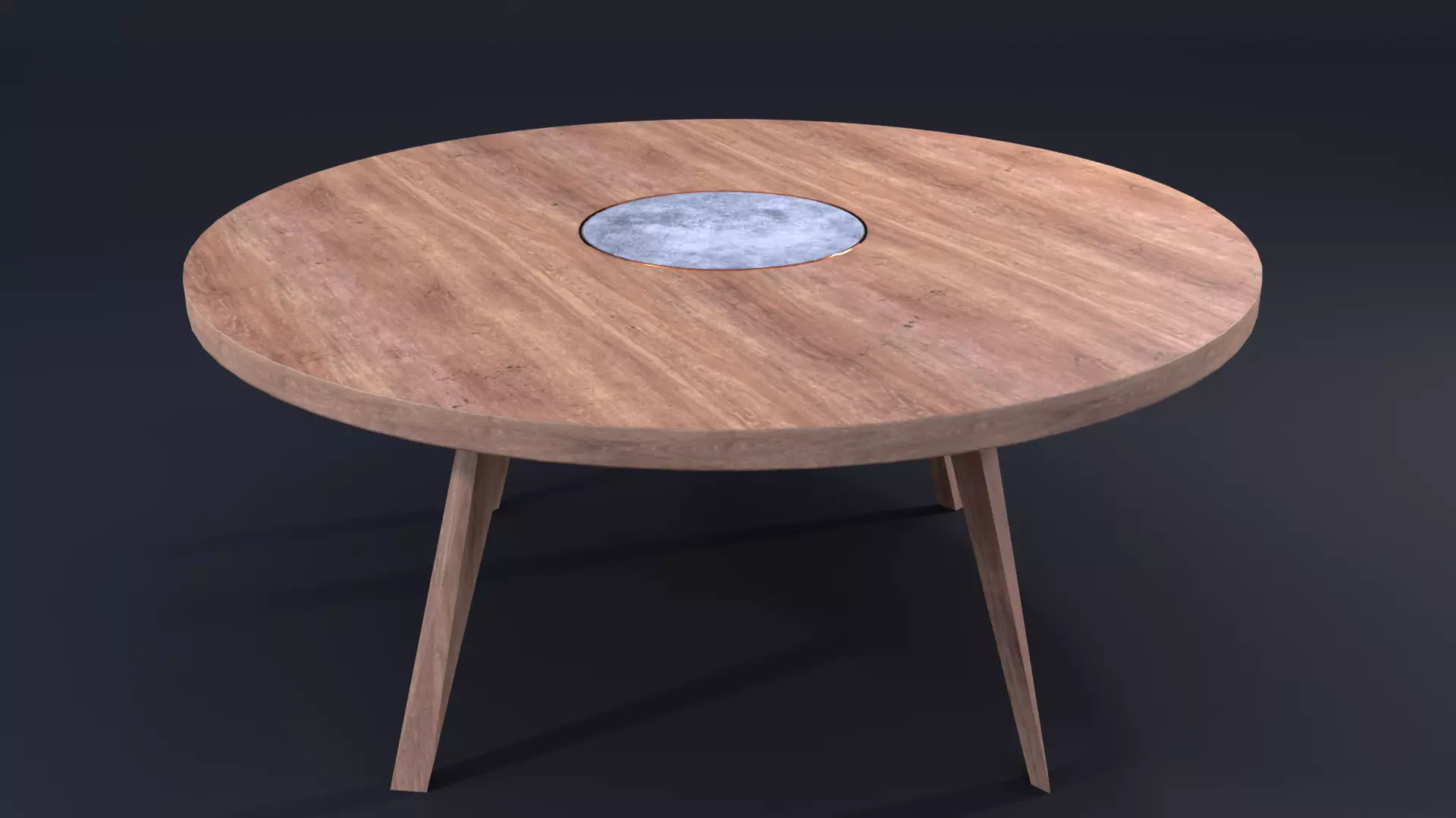 Dinner table with concrete circle at center and copper element.
