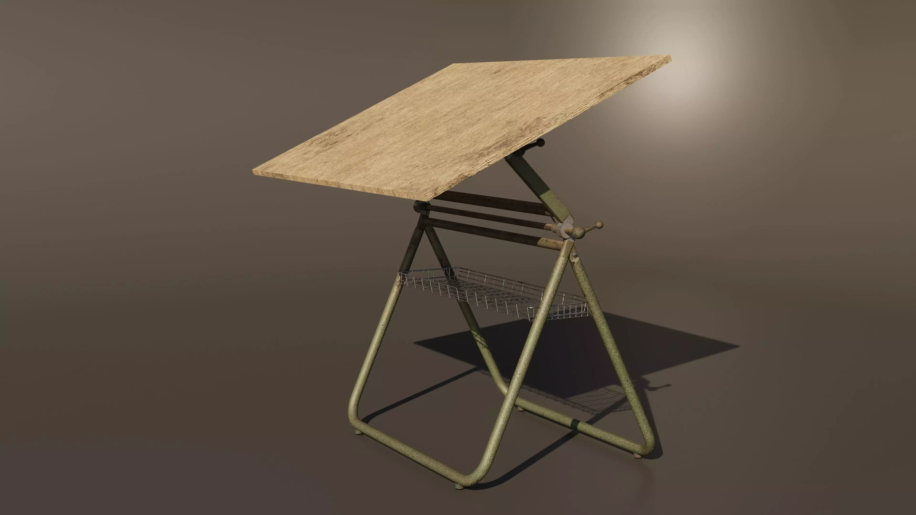 Scale model of an old drawing table with metal frame, used in architecture and engineering offices.The structure is articulated. so, it can be folded in different positions.