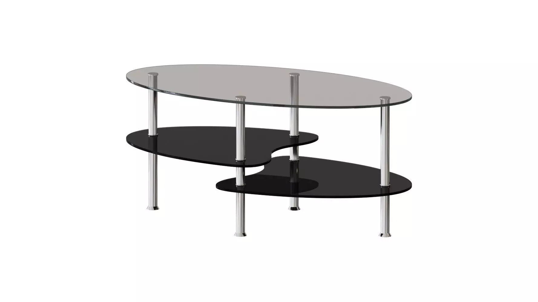 This stylish, contemporary oval two-tier clear and black coffee table offers multiple levels to showcase magazines, books and more. It's distinctive curved legs support tempered safety glass and a frosted lower shelf. Each glass shelf features beveled edges for a smooth, soft edge. Three levels of glass combined with brilliant steel legs create a stunning piece.
