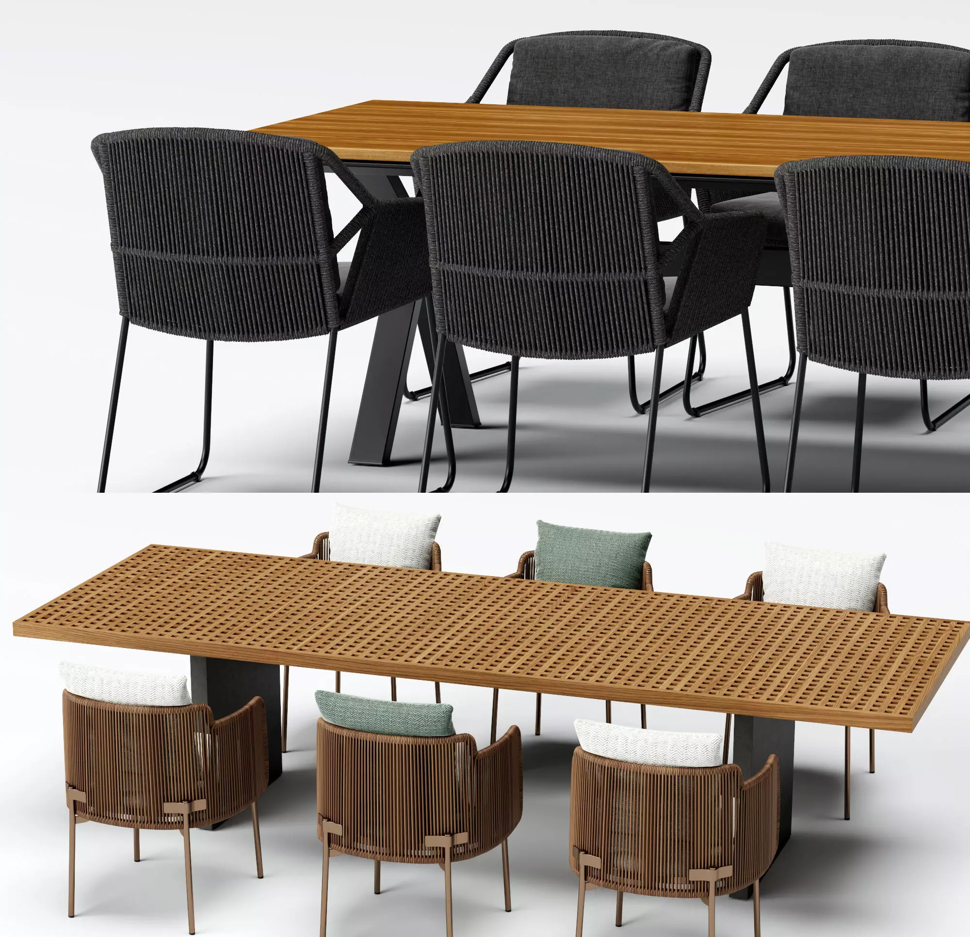 Upgrade your exterior visualization projects with this premium collection of modern outdoor dining furniture. This pack includes two distinct high-quality sets: a sleek solid wood top table with black rope-woven armchairs, and an artistic slatted wood rectangular table paired with brown wicker-style seating and colorful cushions. Perfect for luxury patios, rooftop terraces, garden cafes, or poolside lounging areas.