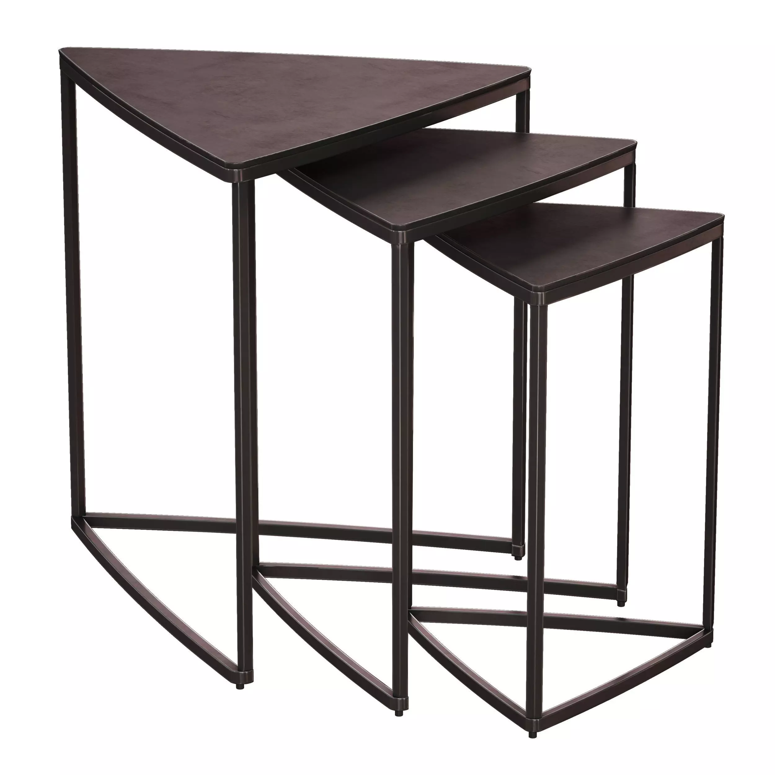 Description of the seller:This eclectic trio of nesting tables serves up flexible functionality along with fun shapes and textures. Rising to three different heights, the tables stand on slim iron legs and an arrow-shaped base that allows them to neatly nest together. Cast aluminum fashions rounded triangle tops that update classic mid-century amoeba curves. An antique brown finish adds a trend-conscious note of industrial chic. Tables cluster together as a tiered arrangement and move about the room when company comes to call.Overall DimensionsWidth: 21Depth: 19Height: 23.5 "