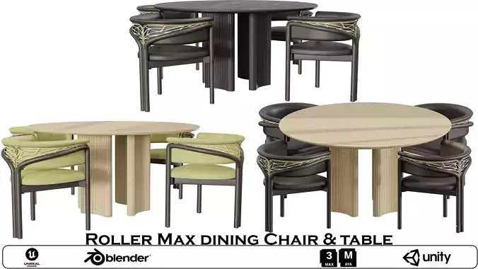 Name: Roller Max dining table and chairType: modelFormat: 3Ds Max 2013Export: FBX, OBJRender: VRay (5.x), Corona (9)Polys: 193518Verts: 501646Matclasses: Multimaterial,VRayMtl,_CoronaPhysicalMtlUnits: CentimetersDimension: 301.71 x 260.98 x 77.8Date: 2025.10.4Elevate your interior scenes with the Roller Max Dining Chair & Table collection, a premium 3D furniture set that blends modern elegance with artistic detailing. Each set includes a round dining table with a vertically paneled cylindrical base and four matching chairs featuring curved backs and intricate web-like armrests. The collection showcases three distinct material combinations: dark wood with black and gold accents, light wood with green and black chairs, and light wood with black and gold chairs.