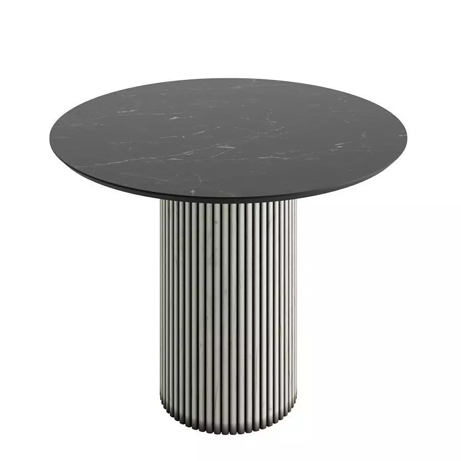 This modern dining table has a stylish round top made of black marble with a light veining pattern. The base is cylindrical and made of vertical grooved elements in gray color, which adds texture and sophistication. Ideal for minimalist, modern or loft interiors.