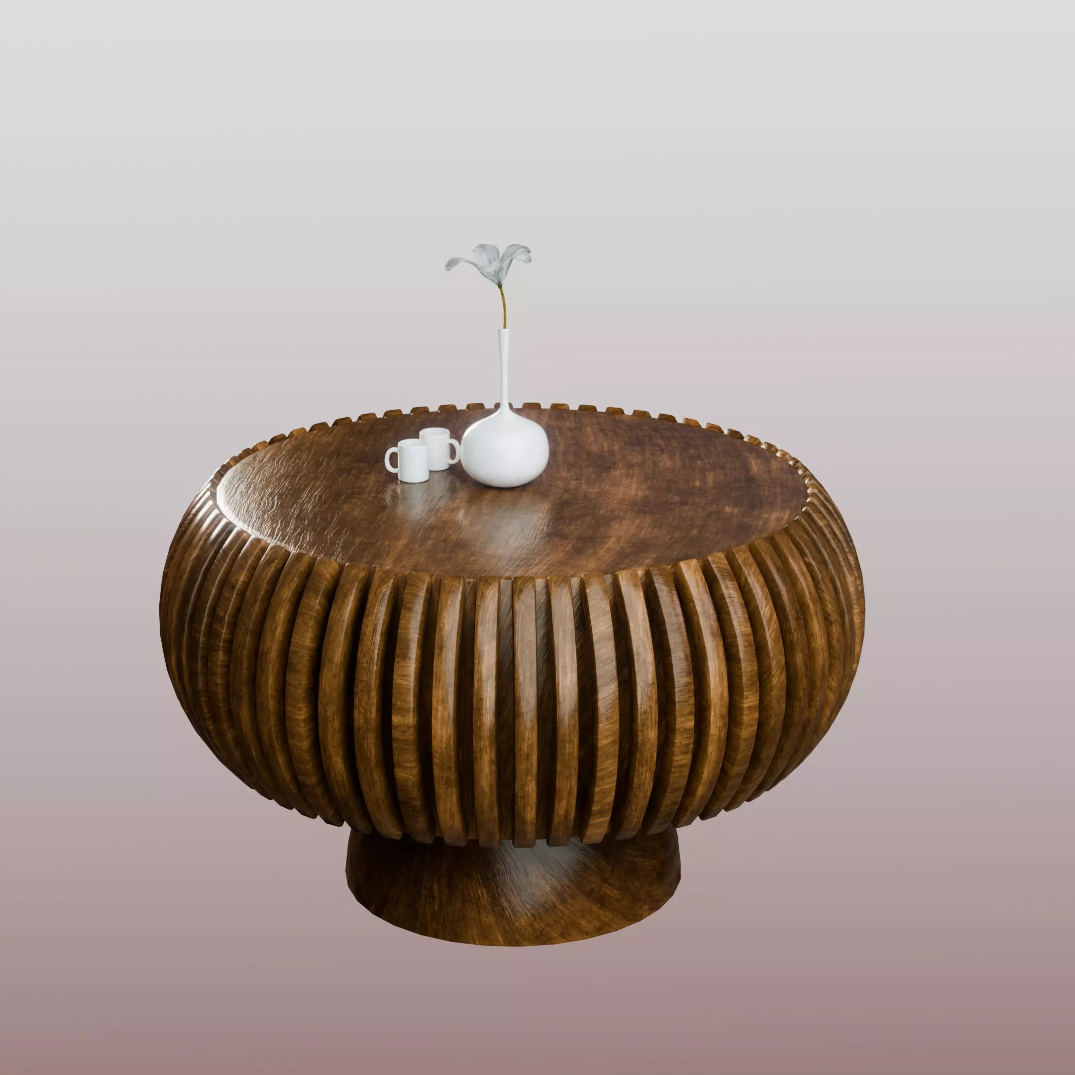 This round ribbed wooden coffee table features a distinctive sculptural form built from curved vertical slats that create a bold, organic silhouette. The tabletop is smooth and polished, resting above a solid rounded base that ensures stability and visual balance.