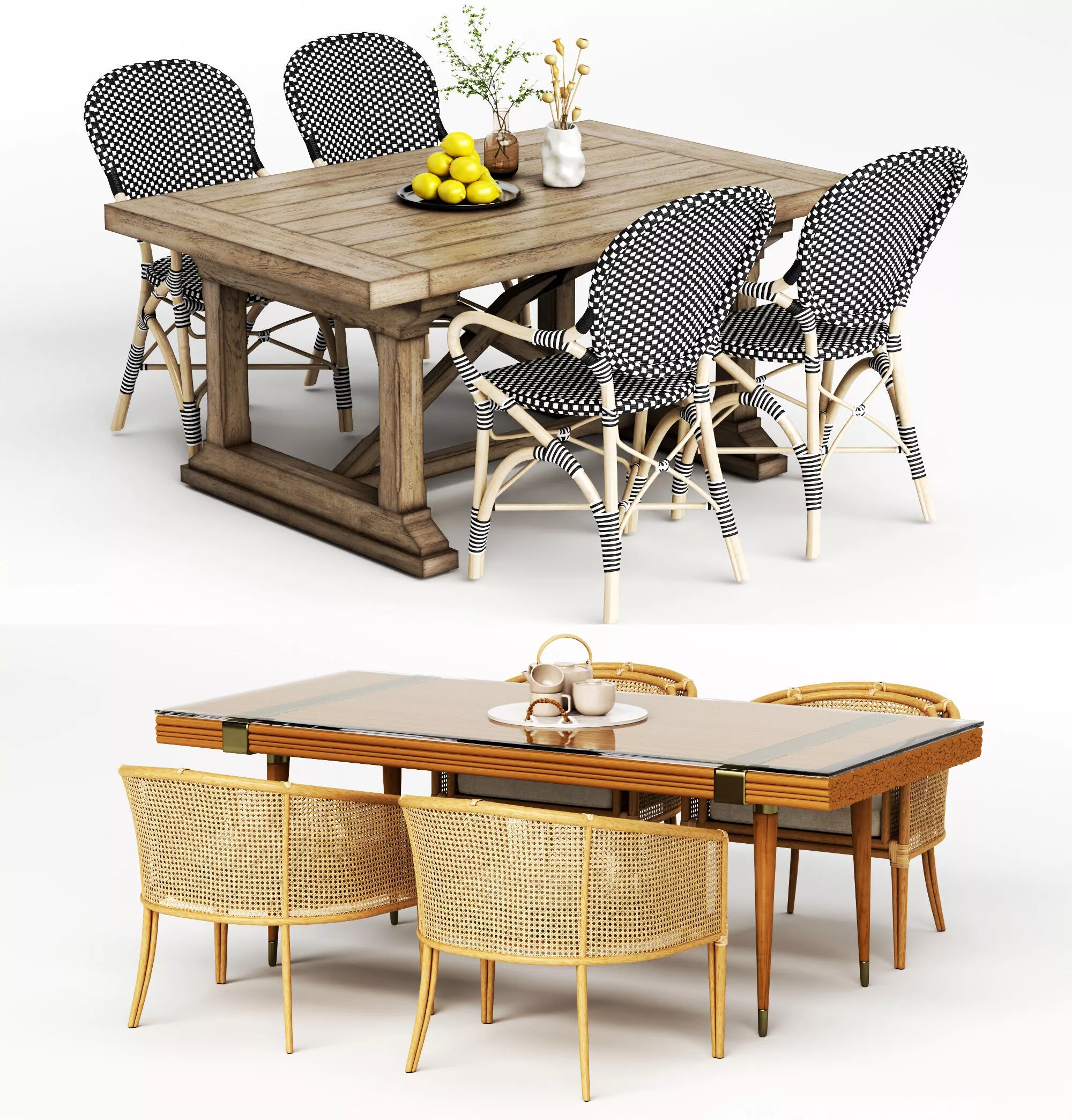 Professional high-quality 3D collection of two distinct Dining Sets meticulously crafted for premium interior visualization and architectural projects. This set features a heavy rustic farmhouse wooden table with bistro-style checkered chairs and a mid-century modern rattan dining set with a glass-top table including realistic table decor like lemon plates vases and ceramic tea sets.