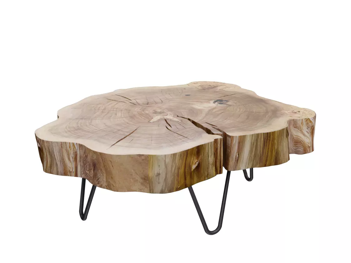 A high-quality, photorealistic 3D model of a natural wood slice coffee table featuring organic live edges and cracks, supported by black metal hairpin legs. Perfect for adding a touch of nature to industrial lofts, Scandinavian living rooms, or modern interior renders.The wood surface features detailed annual rings and natural weathering textures, providing excellent realism for close-up shots.