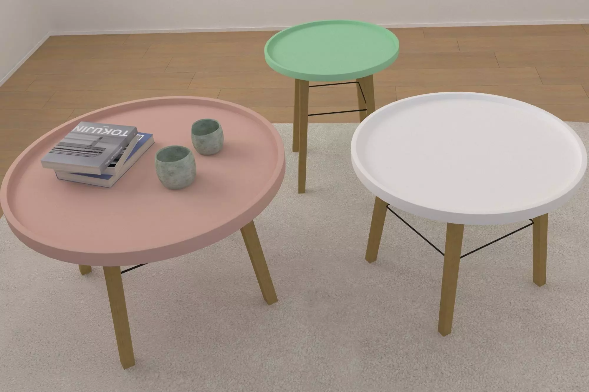 This is a set of three tables in various sizes. This scandinavian style in light colors brightens up interiour visualozations.
