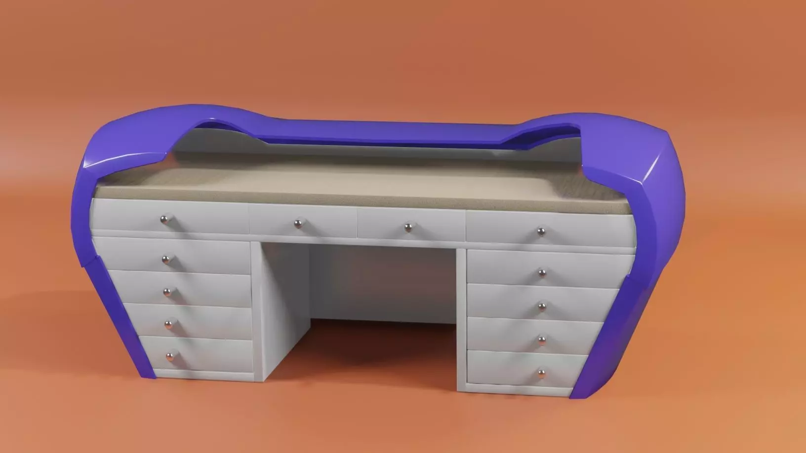 This is an office desk. Designed for offices and office work. It can also be used at home for office purposes. It can be used as a computer desk. Of course, the same can be done for an animated film or video game. Which is not complicated, but it has decorative plastic. Unusual plastic. Why is that? For decoration, of course. And to make it unusual. Designer unusual. Out of some standard. There is a plastic part, and the rest is wood or plastic. The handles are chromed. I love that chrome, especially with mobile phones or cars. Chrome gives a certain elegance to the product. So plastic is a decoration and not only that. What makes it different from other tables.Plastic part with sharp edges. Modern cars have the same design. Sharp edges.