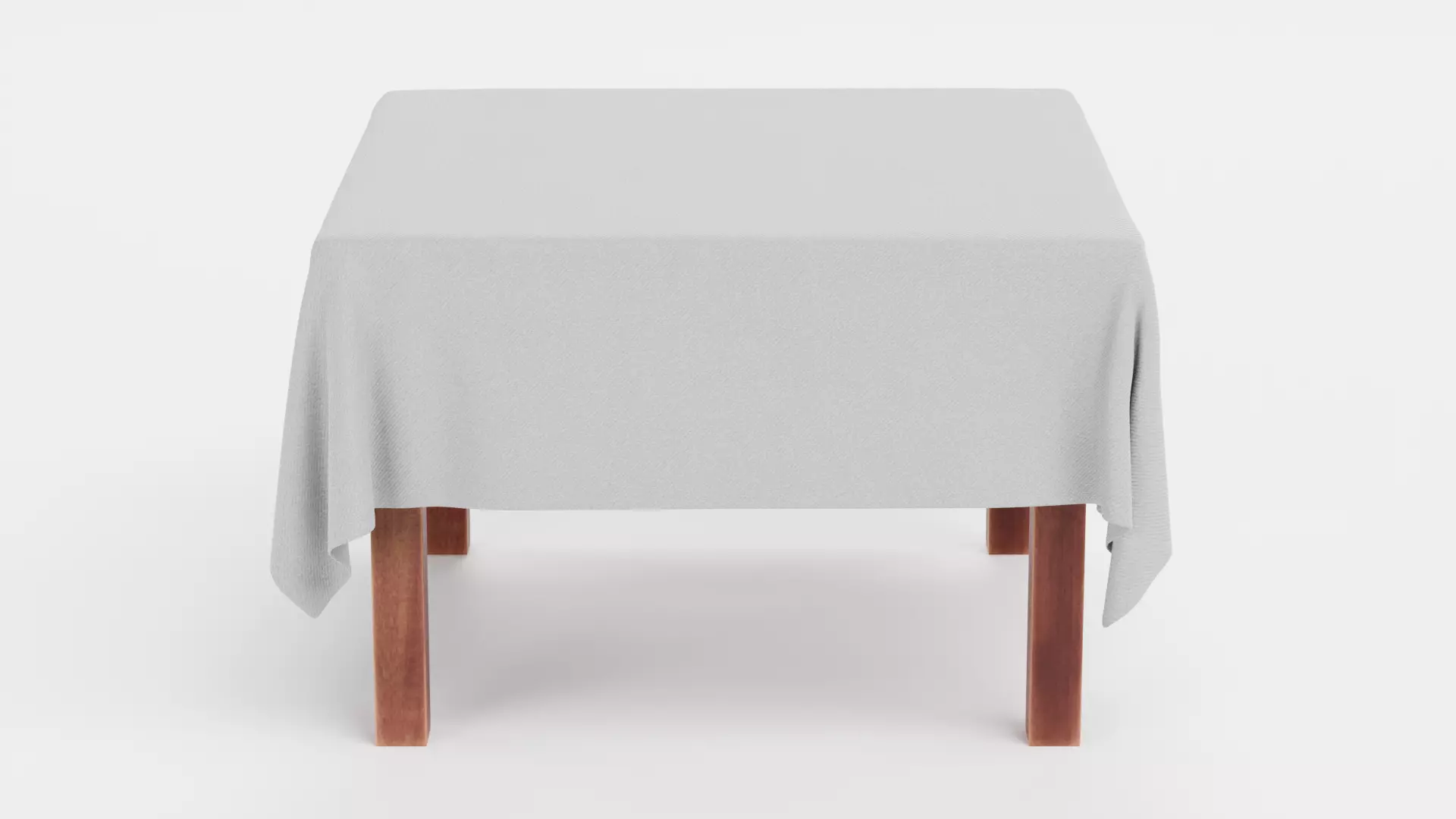 A square table combined with a fitted white linen tablecloth, built as a single dining furniture asset. The textile is shaped directly on the structure, with balanced overhang and corner-driven folds that reflect the underlying form. Visible legs anchor the piece in space, while the fabric layer defines its material identity and presentation role. Works well as a complete covered furniture element in dining interiors, event layouts, banquet scenes, or staged display settings.