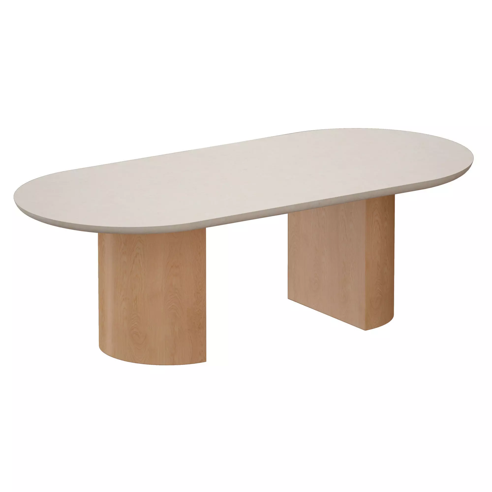 A coffee table with a travertine top, on two semicircular wooden columns.