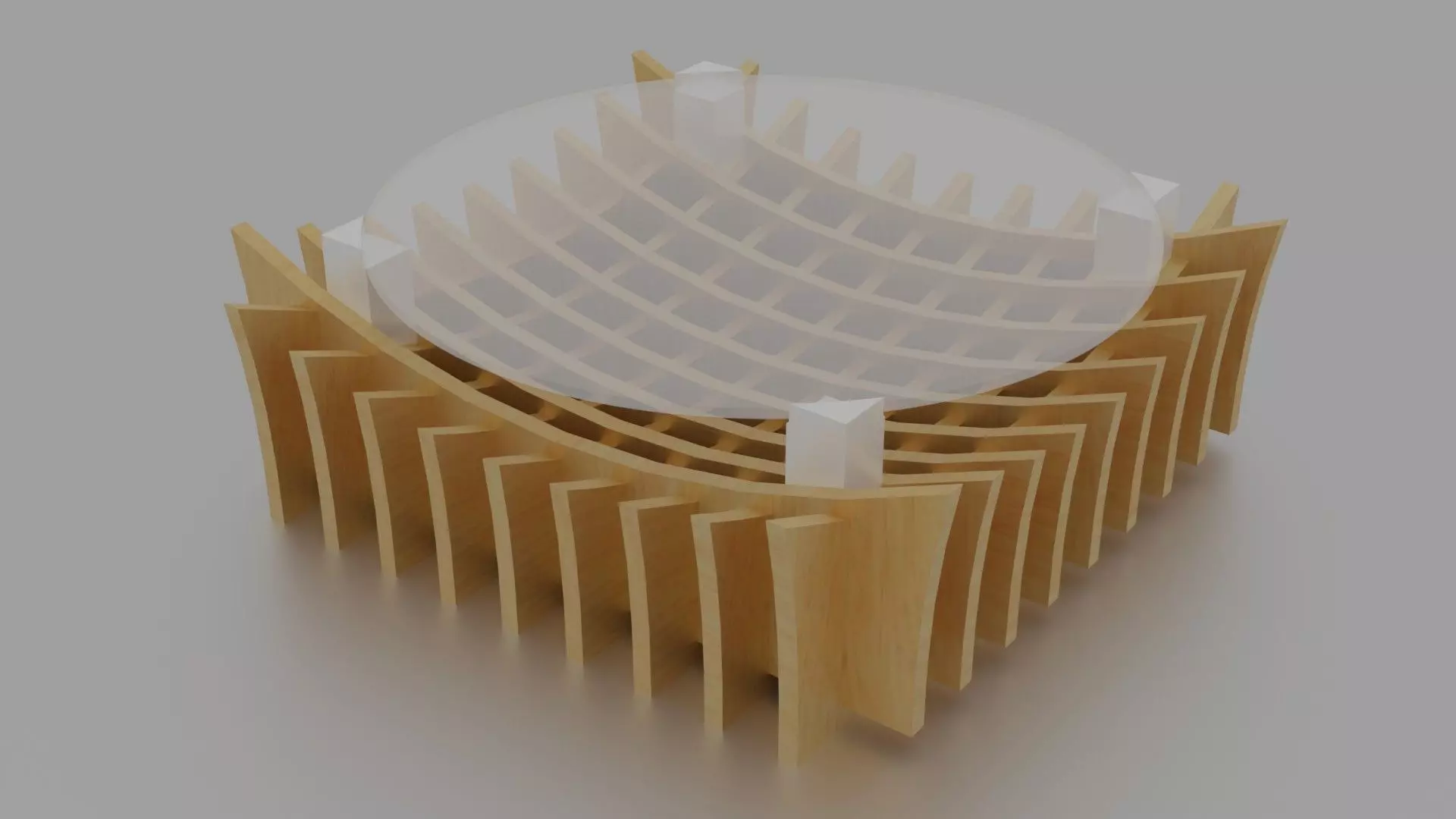 A Coffee Table with Wooden Waffle Structure in a Sci-Fi form, with a circular glass panel on top of four columns that are fixed to four cells of the waffle network cells, the model has two groups of perpendicular wooden beams that are interlocked with slits and the panels outline curves are provided for CNC milling/ cut, the model was created using computational parametric tools to achieve the most accurate geometry with clean details, it could be used for architectural render purposes indoors, and also for interior design, furnishing and decoration.
