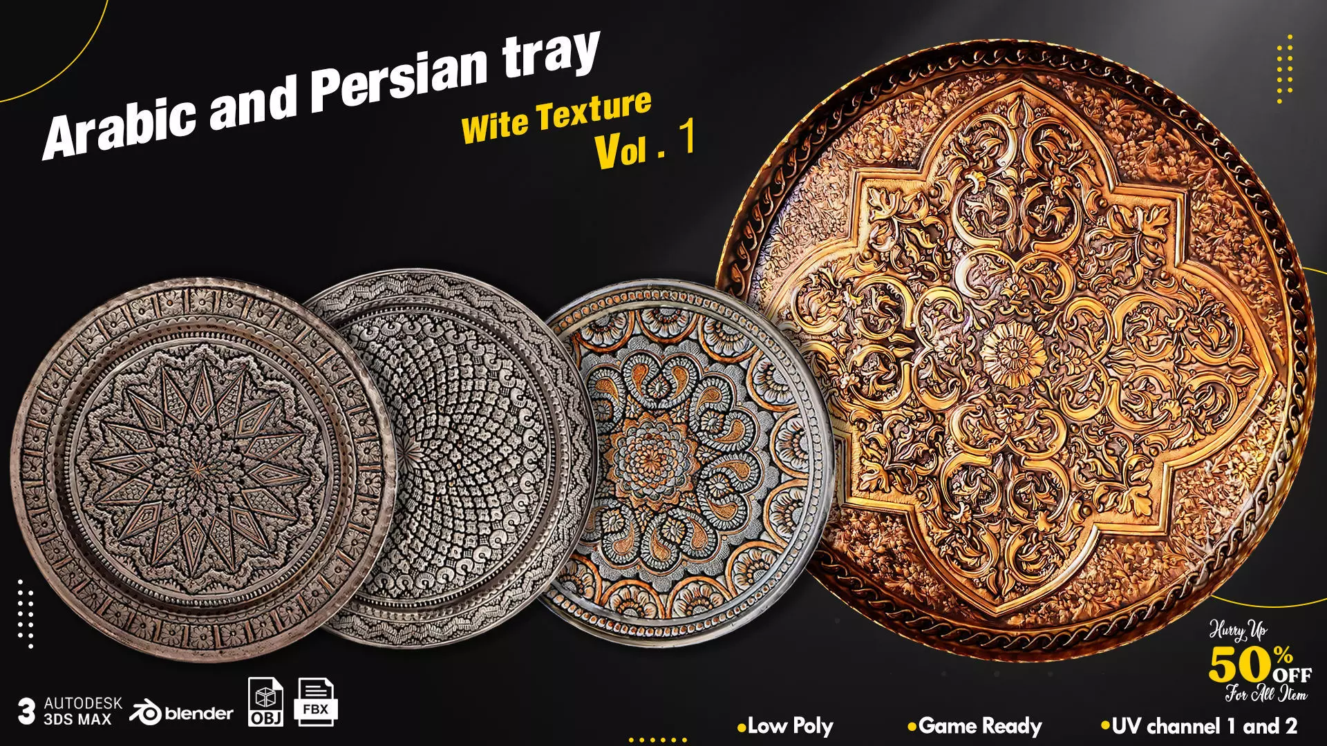 Bring the beauty of Middle Eastern art to your 3D projects with this exclusive collection of Arabic and Persian trays. Each model is crafted with fine geometric and floral patterns inspired by traditional metalwork and ceramic design.