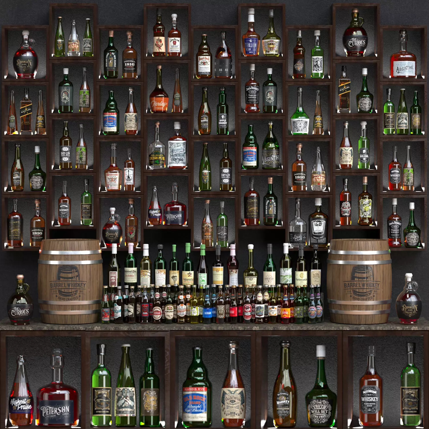 3d model - Fillings for a bar, an alcohol shop.The model of shelves with alcohol and bar countertops has more than 70 unique bottles, wines, whiskey, beer and other beverages. There are two instanced duplicated wine barrels with a brand stencil on them.