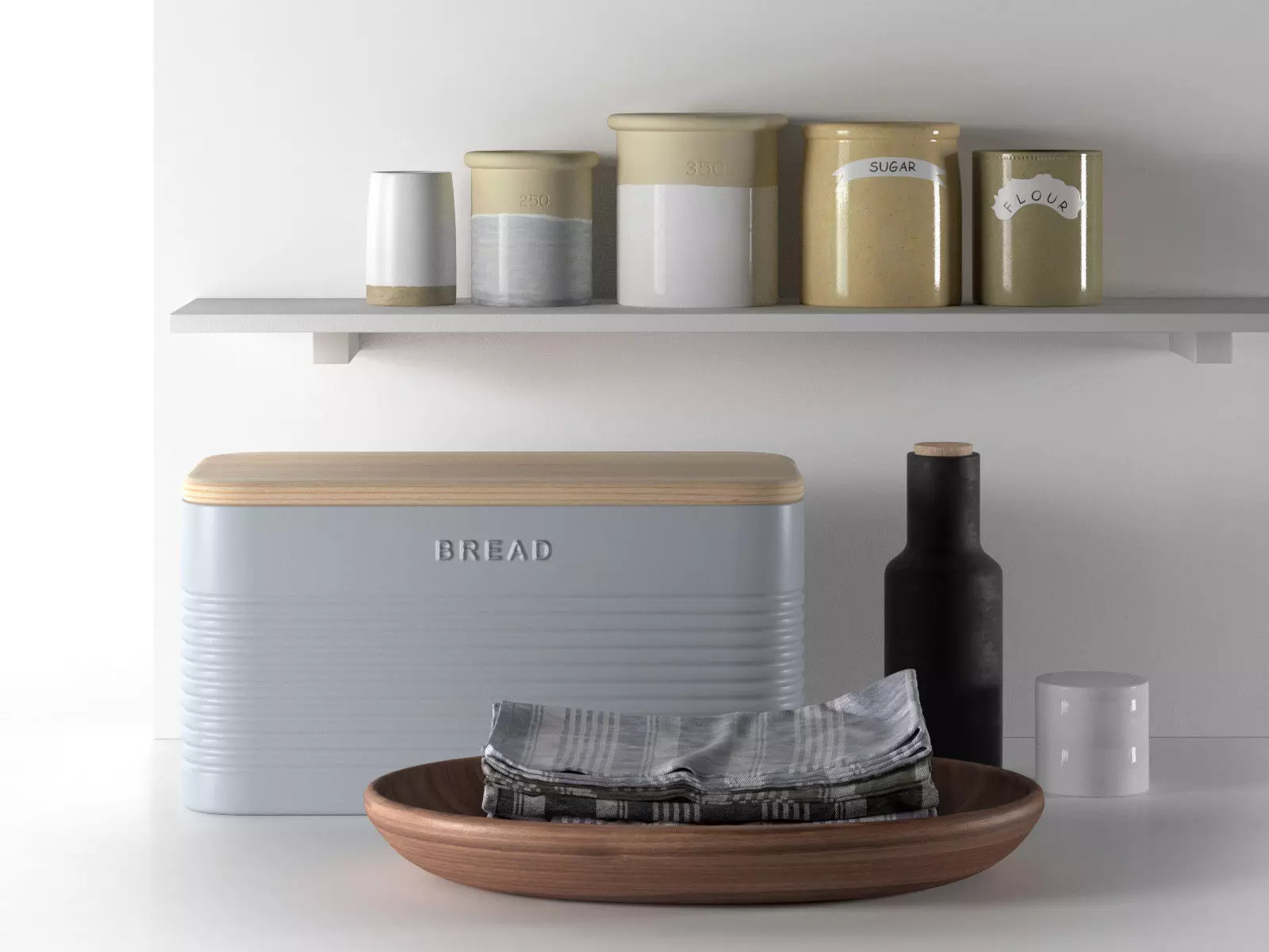 This 3d model Ceramic Containers, Bread Box and Napkins has a fully textured, detailed design that allows for close-up renders. Every model has been checked with the appropriate software.