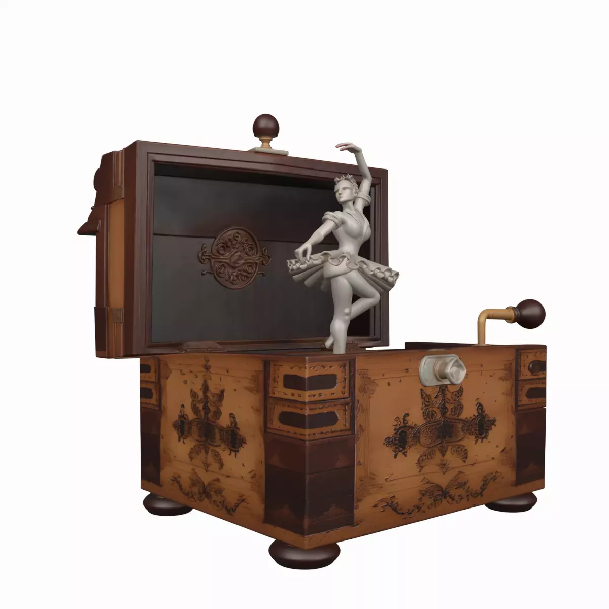 A hauntingly beautiful antique music box crafted from aged dark wood with ornate metallic accents featuring an elegant ballerina ghost that materializes when the crank handle is turned intricate melody engravings adorn the sides telling a spectral tale each view reveals meticulous details from the open front showing the delicate inner workings to the back exposing the complex crank mechanism the left side captures the ballerina in a graceful pose while the right side displays the mystical engraved text a perfect blend of eerie elegance and mechanical wonder designed for detailed 3D rendering in games and animations this haunted treasure invites curiosity with its spectral charm and timeless craftsmanship all presented against a clean white background showcasing four comprehensive perspectives of this bewitching collectible.