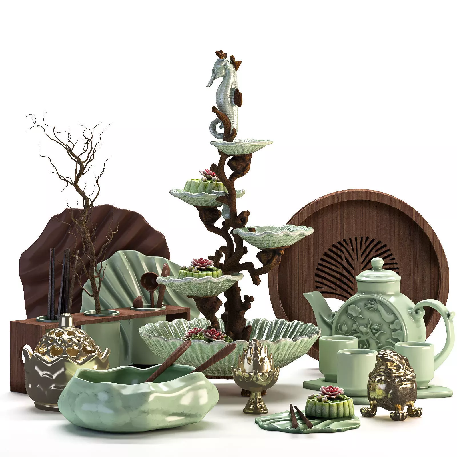 A detailed 3D model of a luxurious Chinese-style kitchen accessory set designed with a blend of traditional art and elegant craftsmanship. The collection features handcrafted elements such as teapots, trays, bowls, and decorative stands inspired by nature and Eastern aesthetics. The centerpiece, a seahorse-shaped serving stand surrounded by ceramic lotus flowers, adds a sophisticated and artistic touch to any interior visualization.