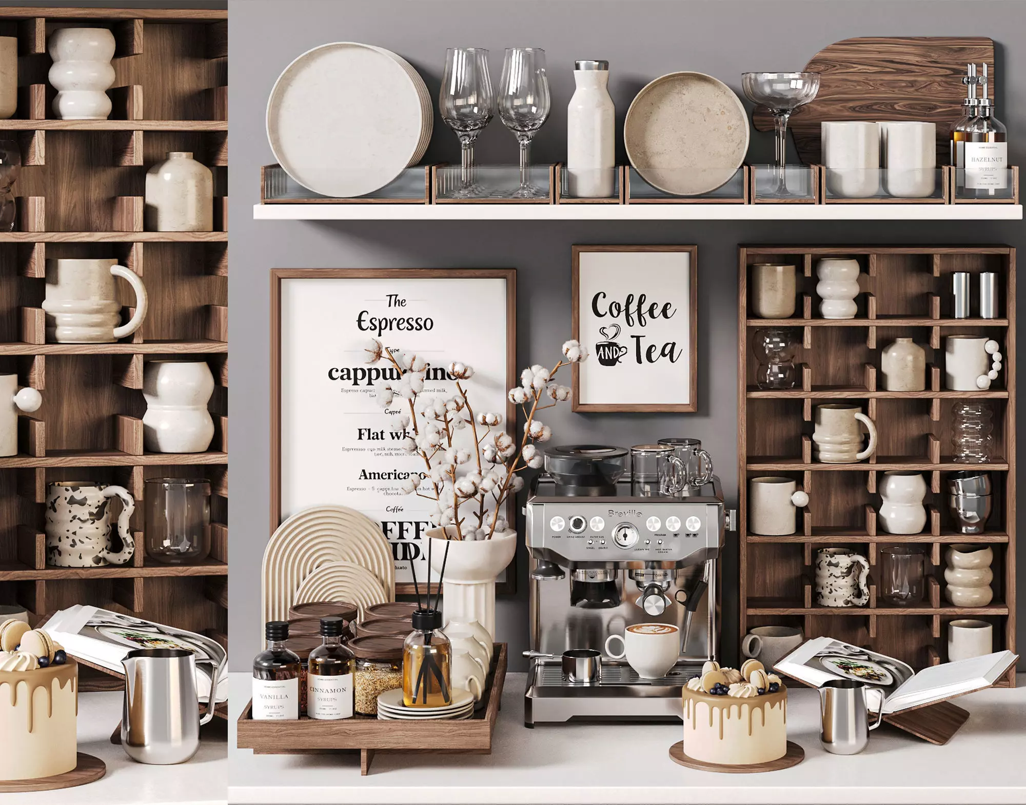 This set includes a high-end espresso machine, beautifully arranged coffee essentials, decorative accessories, and thoughtfully placed elements that bring both functionality and aesthetic charm to your space. Designed for photorealistic renders, it ensures a premium visual experience in any 3D scene.