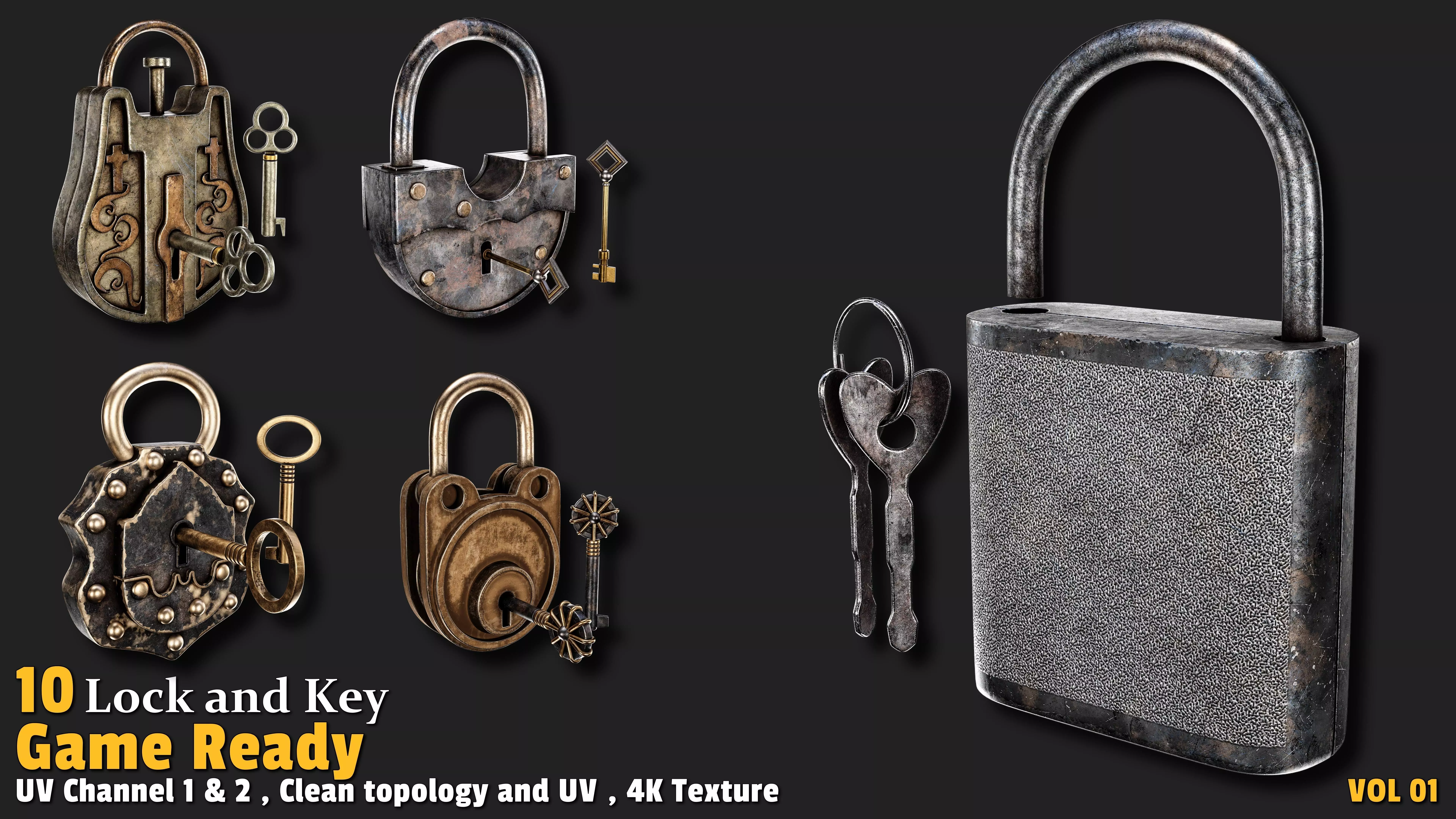 Ready to enhance the security and mystique of your game world with stunning locks and keys? This collection of 10 textured 3D models, featuring professionally crafted locks and keys with 4K textures (including Base Color, Normal, and ORM), is designed to shine instantly in your game development projects! Whether you're creating a fantasy adventure with hidden treasures or a mysterious ancient fortress, these models deliver unmatched quality and realistic detail for an immersive gaming experience. Each model features a clean, quad-based topology with polygon counts ranging from 1,000 to 4,000, offering a perfect balance between performance and detail. UV-unwrapped with 2 texture channels, this set is fully optimized for seamless integration into your game environment without any additional adjustments.
