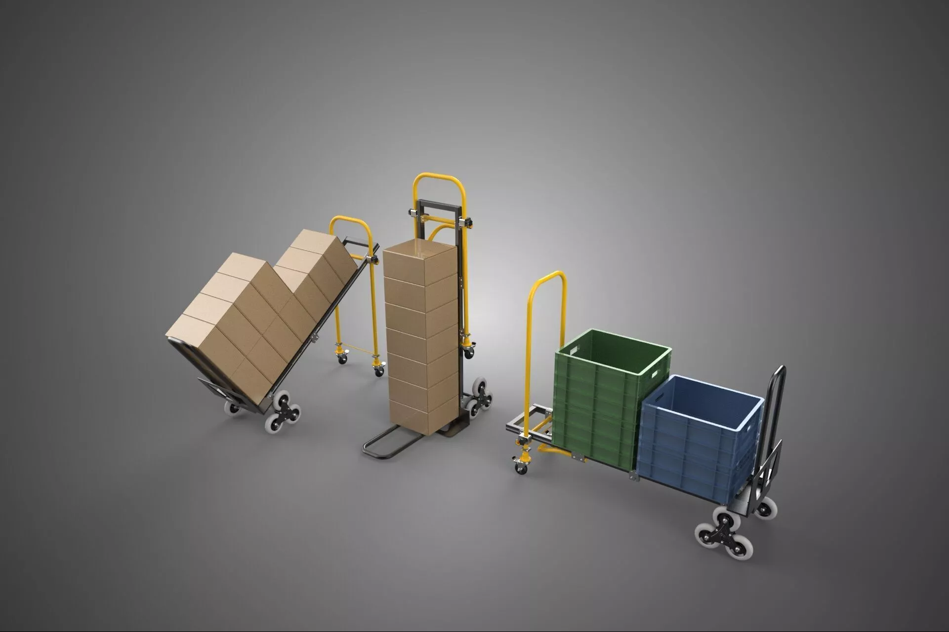 This 3D model collection features a comprehensive digital representation of a three-mode position stair climber convertible hand truck, a quintessential tool in modern material handling and logistics. The design integrates high-utility features that allow the unit to transition seamlessly between three distinct configurations: a vertical two-wheel hand truck, a horizontal four-wheel platform cart, and a specialized stair-climbing dolly. The stair-climbing functionality is achieved through a tri-wheel star configuration, which rotates to navigate steps and curbs with ease, significantly reducing the physical burden on the operator. Constructed with attention to industrial standards, the models showcase reinforced structural framing typically associated with heavy-duty aluminum or powder-coated steel builds. Key mechanical details, such as the spring-loaded locking pins for mode conversion and the ergonomic multi-position handles, are modeled with precision. These digital assets are ideal for use in architectural visualization, industrial safety training simulations, warehouse management software, and retail environment planning. The collection provides versatility for creators needing realistic logistics equipment that demonstrates mechanical adaptability and robust engineering. By capturing the dual-purpose nature of the convertible frame alongside the mechanical complexity of the specialized wheel assemblies, this collection serves as a highly detailed resource for any project requiring professional-grade transport tools.