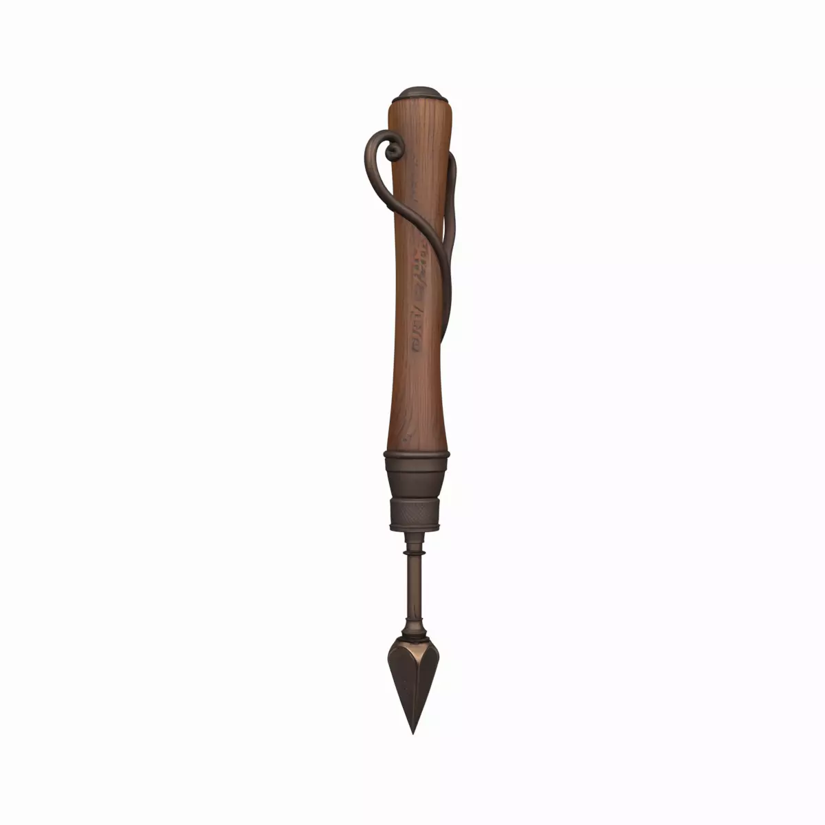A mystical witch's cauldron stirrer featuring a sturdy dark wooden handle with an ergonomic grip and a weathered metal tip bearing intricate engravings of ancient spells. The surface showcases dried potion residue with vibrant color drips that have accumulated over time, creating a realistic and authentic appearance for fantasy game environments or magical animations. Rendered from multiple angles including front handle grip, back tip shape, left side residue patterns, and right side engraved details for comprehensive 3D modeling reference.