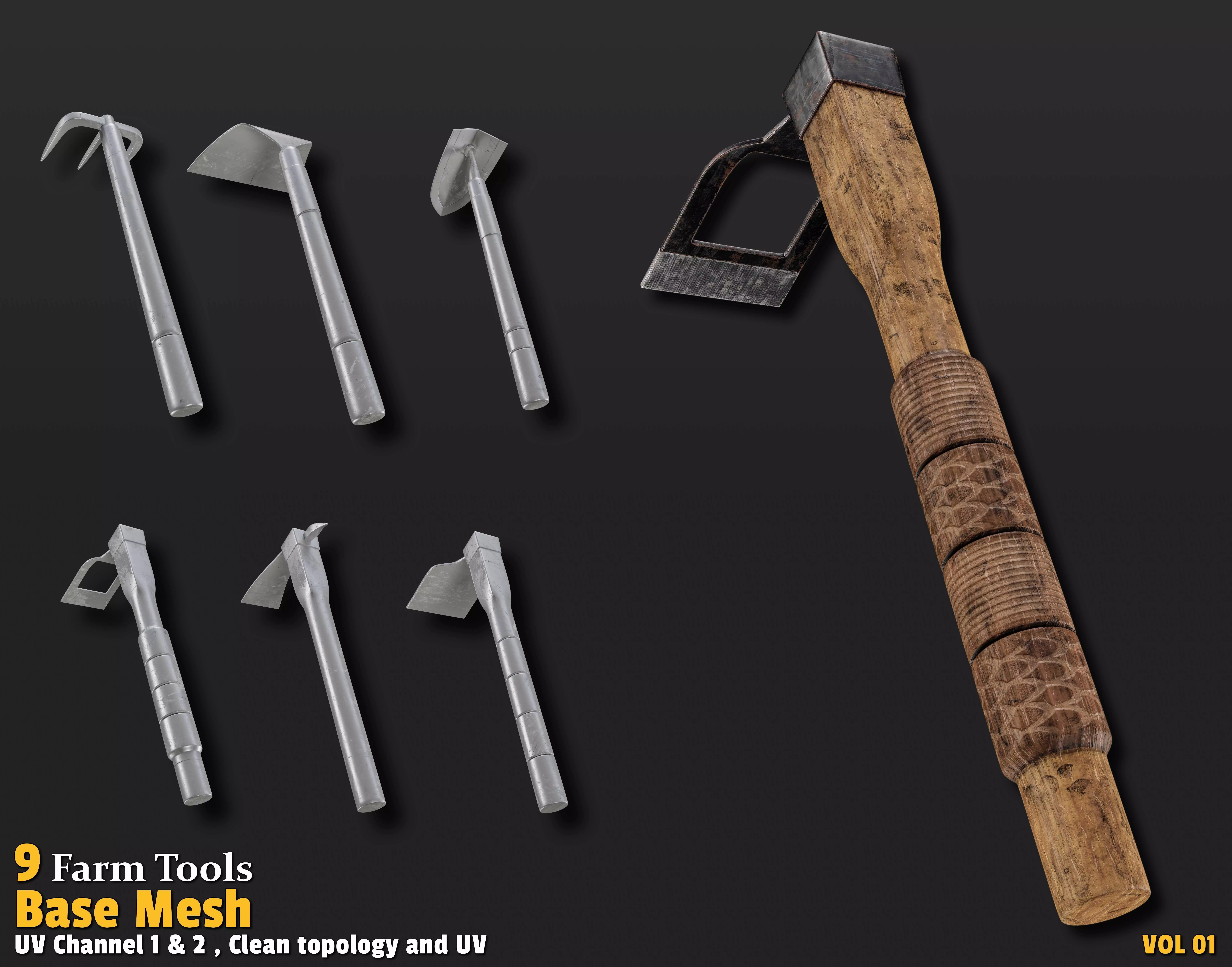 Discover this high-quality collection of 9 meticulously crafted farming tool models, perfect for your next 3D project! Each model in the Farm Tools set features a clean, quad-based topology with polygon counts ranging from 500 to 3,000, ensuring optimal performance and flexibility. These models are UV-unwrapped with 2 texture channels (Channel 1 and 2), ready for texturing, material application, and customization to suit your creative vision. Ideal for agricultural scenes, gardening simulations, or animation projects, these assets are designed with precision and versatility in mind. Whether you're building a virtual farm, creating a game environment, or developing a detailed visualization, this collection offers ready-to-use tools with smooth geometry and a solid foundation for further personalization.