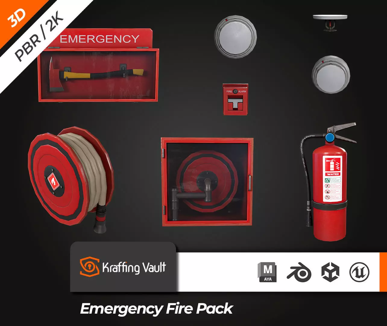Kraffing presents a 3D modeling Emergency Fire Pack V1. Recreated design so you can use it in personal projects, scenes, videogames and more.