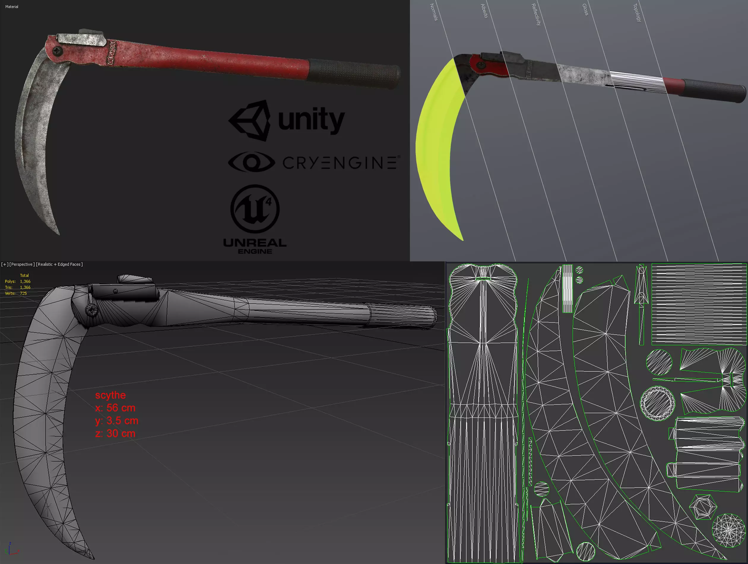 Ready for use in game engines such as Unity3d, Unreal Engine 4, CryEngine 5.Normal map was baked from a high poly model.The textures of the model are applied with UV Unwrap.Including OBJ, FBX formats and textures (4096x4096) TGA, TIF Units used: cmscythe x: 56, y: 3.5, z: 30cm