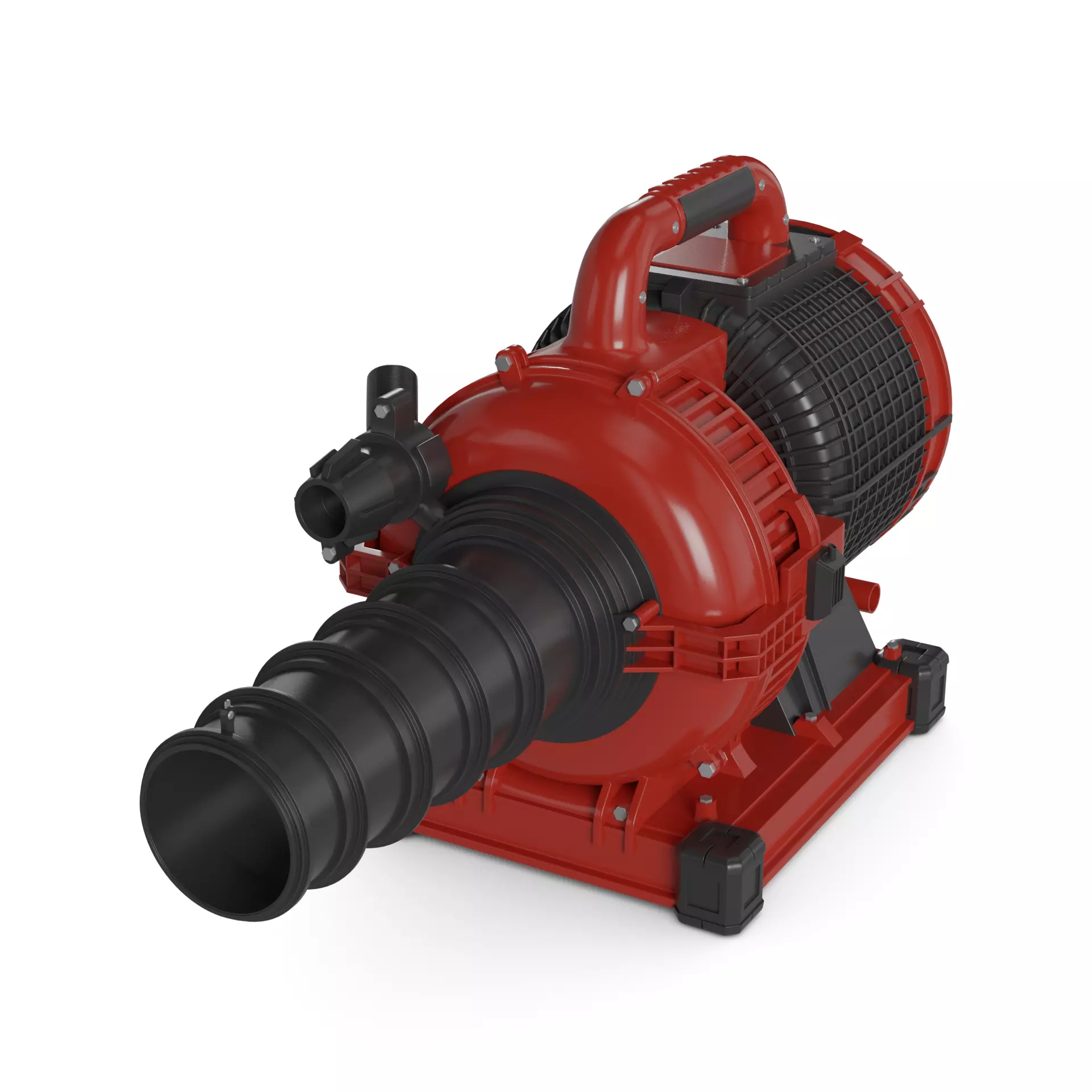 A professional-grade jobsite blower in bold red color, with a reinforced nozzle for precision airflow, built for demanding tasks on construction sites, powered by a high-performance motor and adjustable fan speed.