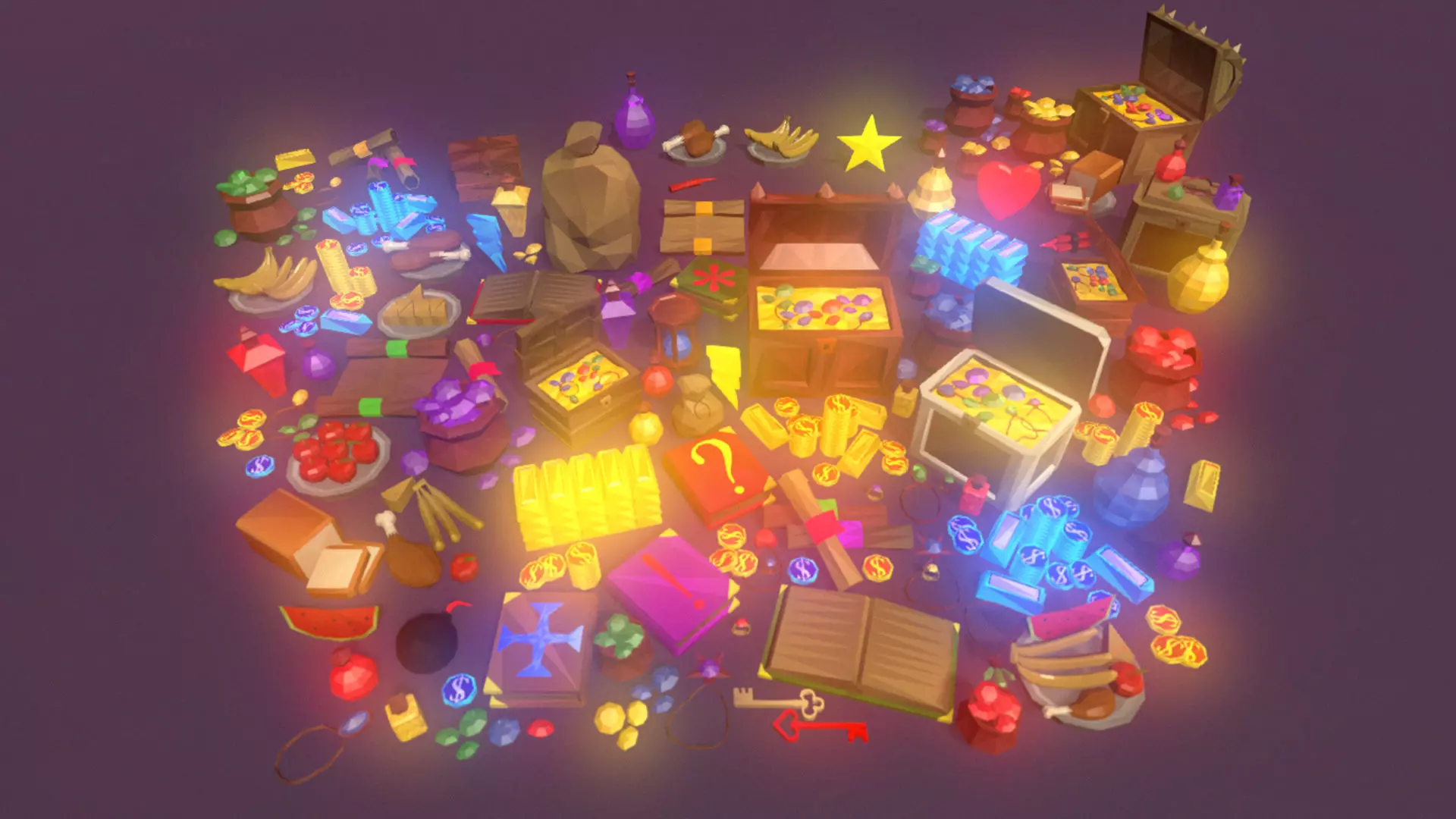• more than 128+ different models - Treasure Chest, Bonus (Bolt, Heart, Clock, Key, Money bag, Star, Bomb, Dynamite), Books & Scrolls, Currency, Foods (Apple, Banana, Watermelon, Bread, Chicken, Cheese, Plate) Jwells (Gem, Pendant, Ring) Potions.• Treasure Chest Animation (Open & Close)• All models prefabs has Physics Colliders attached.• All models prefabs use single Albedo 1024x1024 Texture Atlas and 1 Material.• Gems 5 Material(RBGYP)• Demo Scenes• Mobile Friendly Assets
