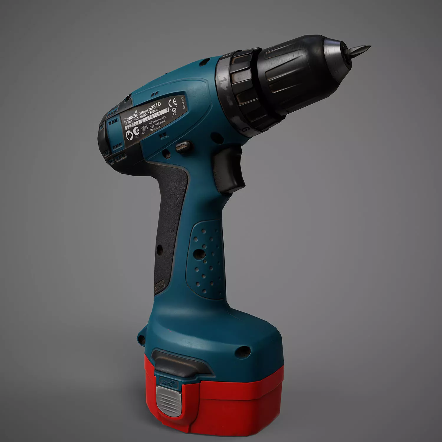 A detailed and realistic 3D model of a classic Makita-style cordless drill, perfect for game development, product visualization, cinematics, or realistic prop design.The model features clean topology, accurate proportions, and carefully crafted materials that replicate used plastic surfaces, rubber grips, and subtle wear marks.