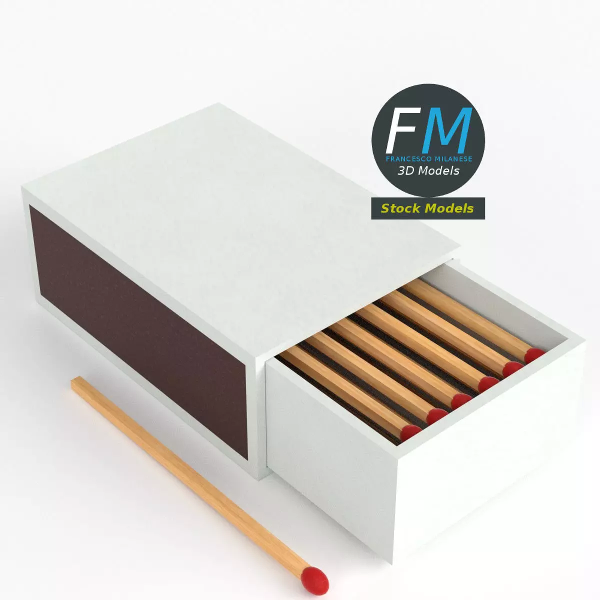 Matchbox 3D Model. 3 individual objects (matches in a box; matchbox; single match), sharing the same non overlapping UV Layout map, Material and PBR Textures set. Production-ready 3D Model, with PBR materials, textures, non overlapping UV Layout map provided in the package.