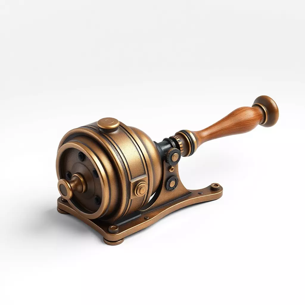Presenting a meticulously crafted 3D model of a vintage steampunk-inspired mechanical device, resembling an intricate crank mechanism. This highly detailed asset features a robust metallic body, predominantly finished in a rich bronze or aged copper texture, complemented by a finely sculpted wooden handle, giving it an authentic, retro-futuristic appeal. It is perfectly suited for a wide array of digital applications, including enriching game environments for fantasy, sci-fi, or adventure genres, enhancing architectural visualizations with unique industrial accents, or serving as a compelling prop in animated shorts and digital art compositions. The model is optimized for real-time applications such as augmented reality (AR) and virtual reality (VR) experiences, ensuring seamless integration and smooth performance. Key features include clean and efficient topology, ensuring easy manipulation and rendering. It comes fully UV unwrapped, facilitating straightforward texture application, and includes high-quality PBR (Physically Based Rendering) textures to deliver realistic material representation under various lighting conditions. Supported file formats include GLB, OBJ, FBX, DAE, USD, ABC, PLY, and STL, providing extensive compatibility for diverse workflows and potential high-detail 3D printing. This versatile model will add a distinctive and complex mechanical touch to any 3D scene, making it an invaluable asset for creators seeking to evoke a bygone era of elaborate machinery.