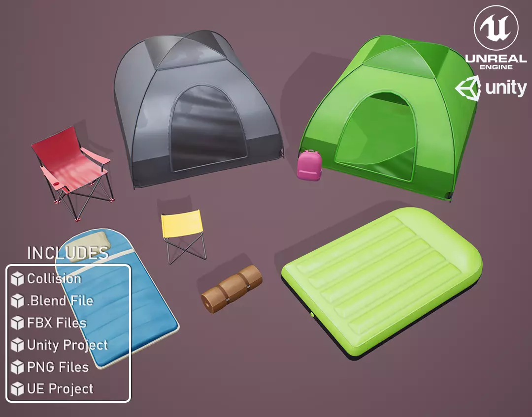 Stylized Rest Camping Items you will find 9 Stylized Props that includes: Tents, Sleeping Bag, Chair, Backpack Camping Mat and More. All to give a new look in your Camping Scene!
