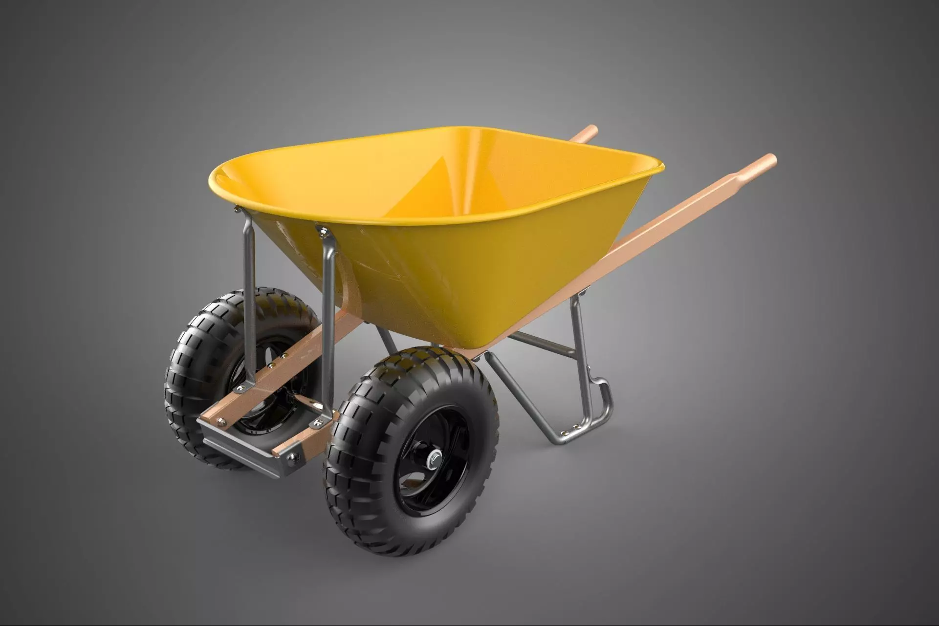 The receptacle, or pan, is designed to hold the transported materials. It is explicitly identified by its yellow coloration. This tray is typically manufactured from pressed steel (often ranging from 16 to 20 gauge for durability) or, less frequently, from high-density polyethylene (HDPE). The vibrant yellow hue serves both an aesthetic purpose and a visibility function on active worksites. The capacity of a heavy-duty twin-wheel barrow usually ranges between 100 to 170 liters (6 to 10 cubic feet), depending on the specific model requirements for dry or wet loads. The tray is attached directly to the steel frame using standardized hardware.