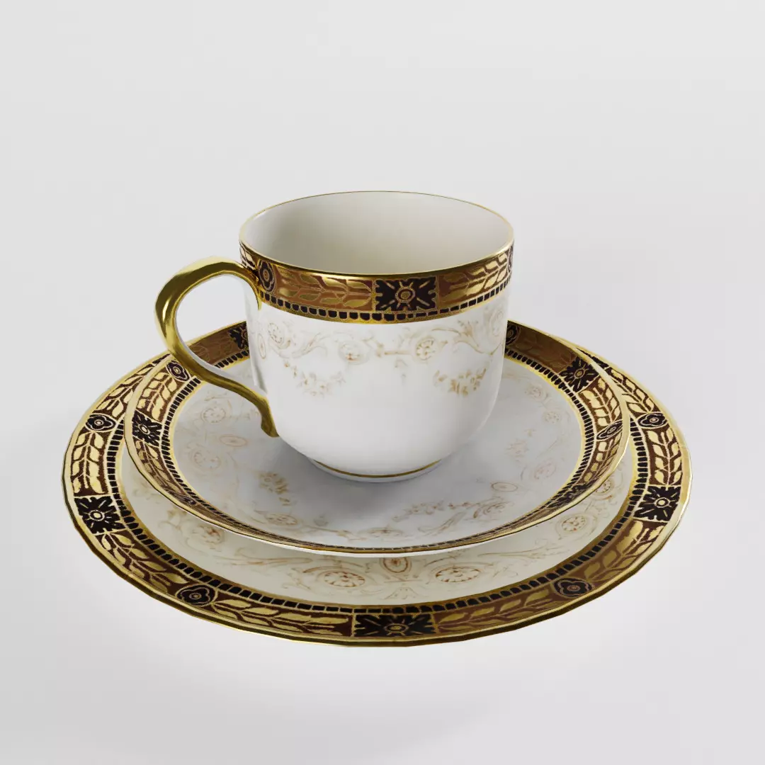 The models have real world scale (diameter of the side plate is 17 cm; saucer diameter is ca. 13.6 cm; the coffee cup is ca. 6.3 cm in height) and were modelled after real existing dishes. The file consists of three seperate, but grouped and parented meshes: Antique Coffee Cup, Antique Coffee Cup Saucer and Antique Side Plate. Exception: in the .ply-file they are all joined together.