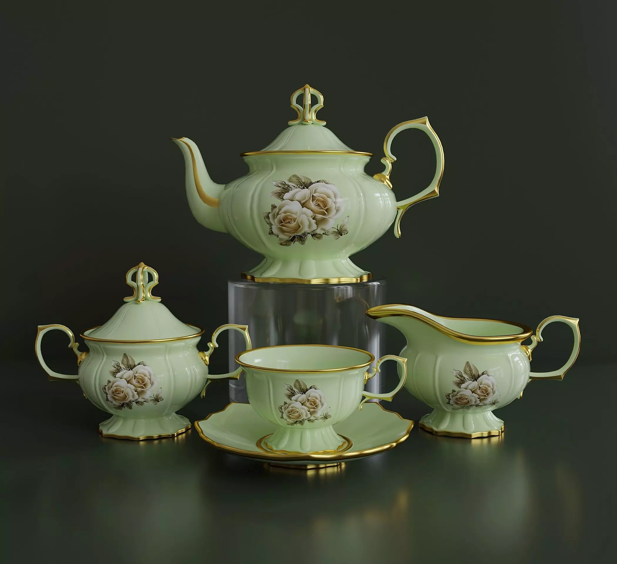 Antique light green and gold porcelain tea set with flowers. The set consists of four items: a teapot, (with a removable lid) a cup with a saucer, a sugar bowl (with a removable lid) and a container for milk (cream). Items are NOT linked to each other. The texture (flowers) is packed in a zip archive) (the picture is applied on both sides of the objects)